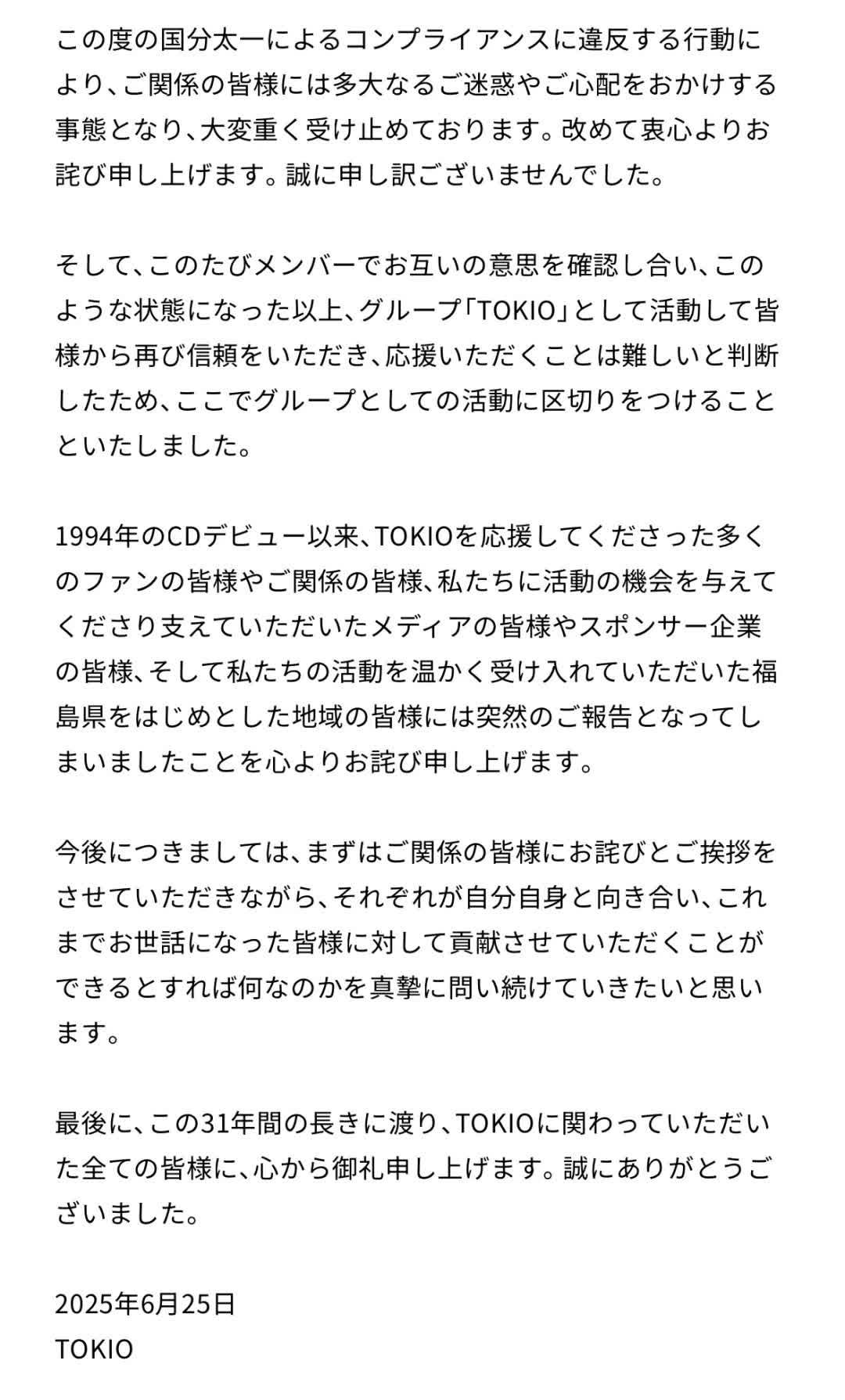 本次事件發生後,成員間進行多次溝通與意見確認,認為在這樣的狀況下,已難以再以「TOKIO」的名義活動並獲得大家的信賴與支持,因此決定為團體活動劃下句點。