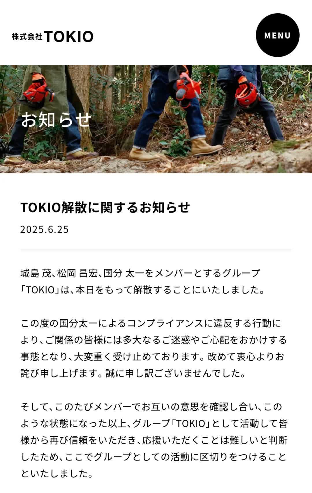 我們在此宣布,由城島茂、松岡昌宏、國分太一三人組成的團體「TOKIO」,已於今日正式解散。