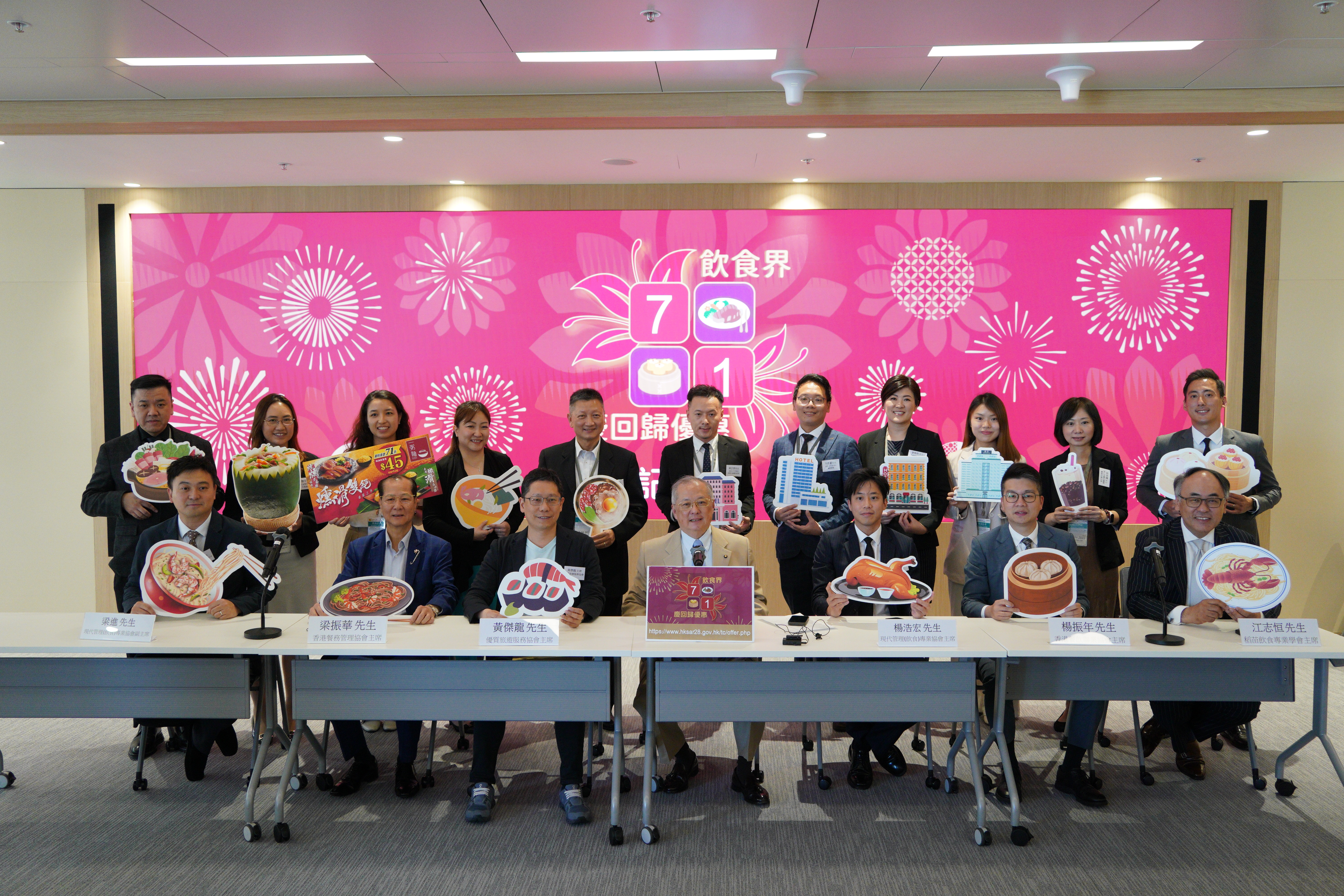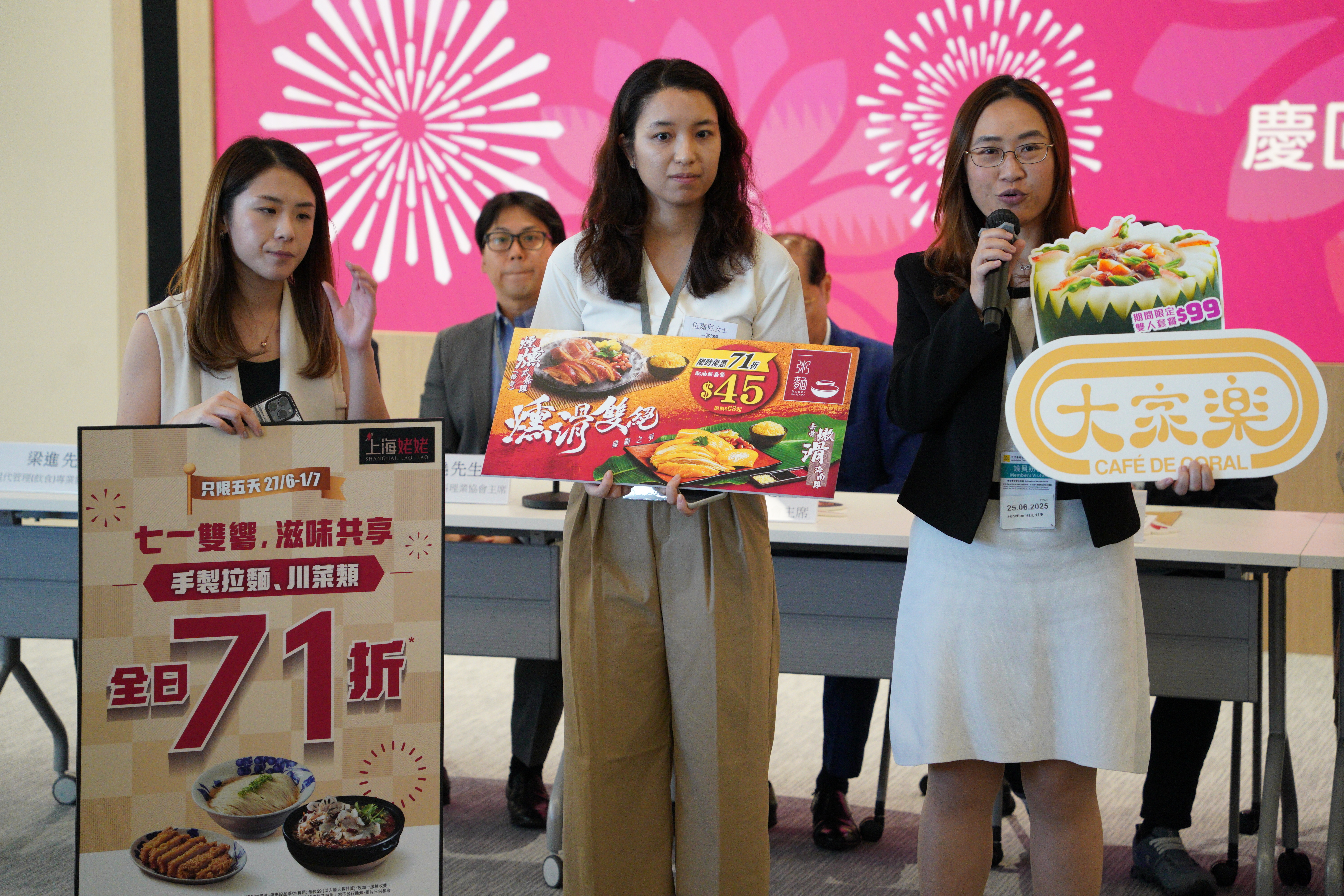 大公文匯全媒體報道,為慶祝香港回歸祖國28周年,飲食業界代表今日(25日)下午舉行記者會,講解業界舉辦七一餐飲優惠安排詳情。多間食肆、酒店及麵包店等商戶,推出堂食或部分商品享七一折優惠,有食肆當日會提供方便長者進食的餐飲,例如軟餐及甜品等,並有特別優惠。