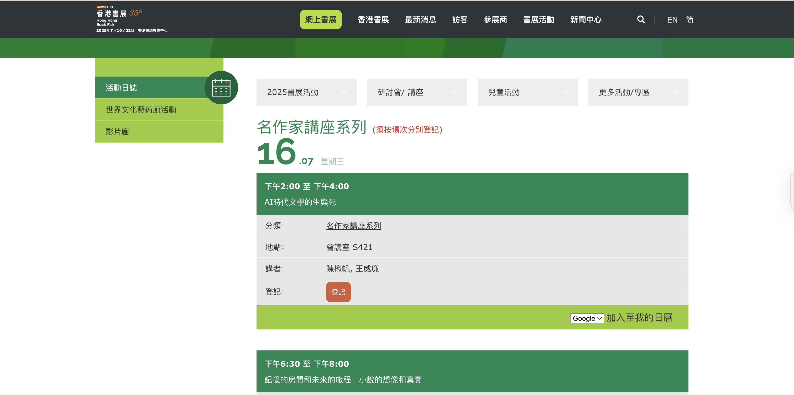另一方面,「名人講故事」系列則邀請奧運劍擊金牌得主江旻憓、藝人陳家樂及陳凱琳與觀眾面對面,分享他們與書本之間的故事。需要注意的是,名作家講座系列須按場次分別登記,其他書展活動則是點擊「登記其他活動」按鈕統一登記,部分未顯示的活動會在預約界面完整顯示。(點此進入登記界面)