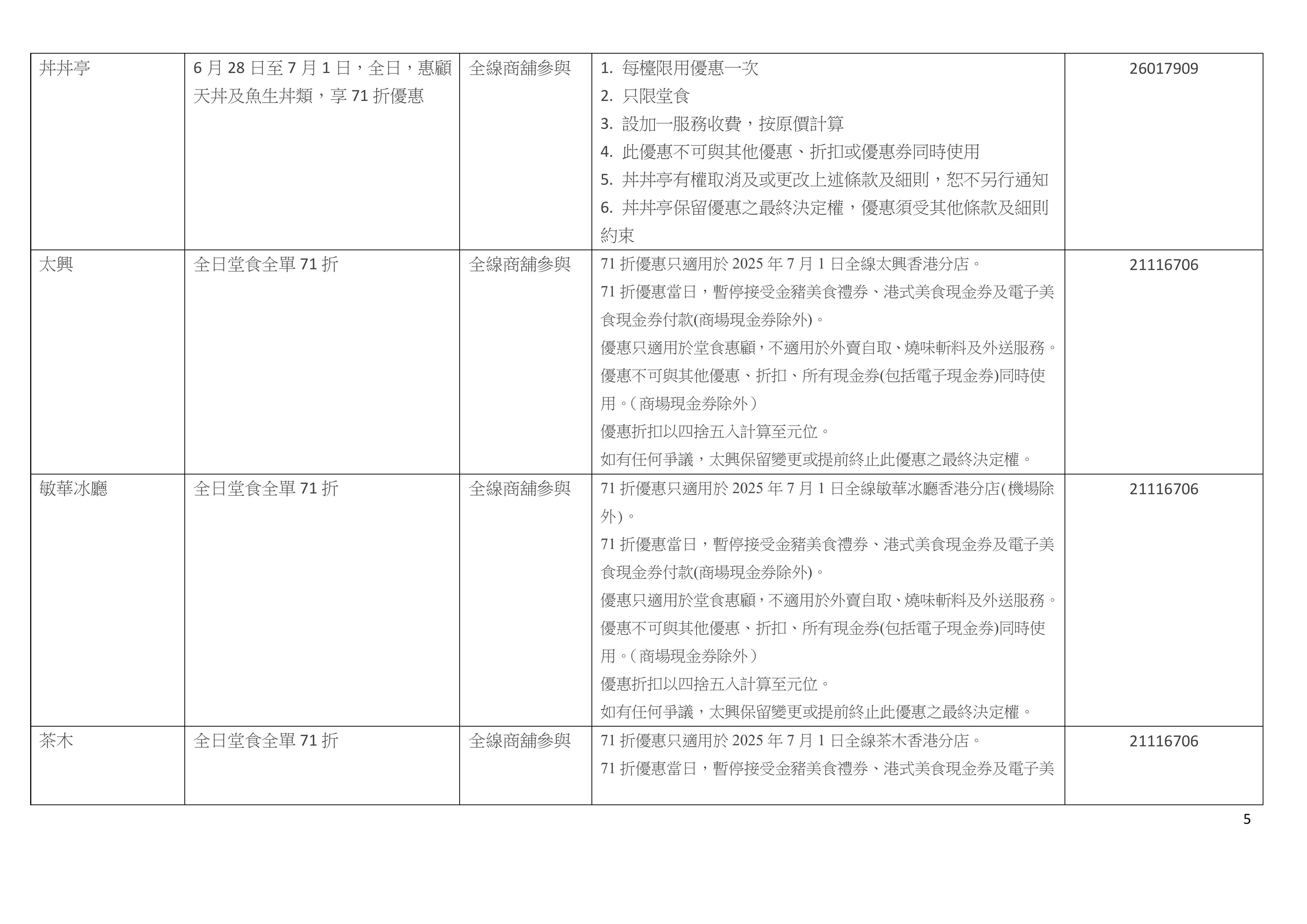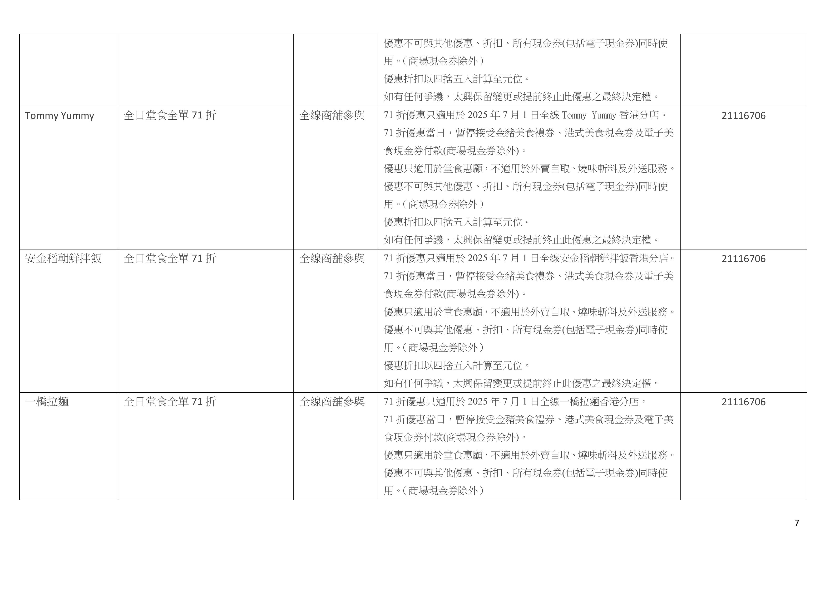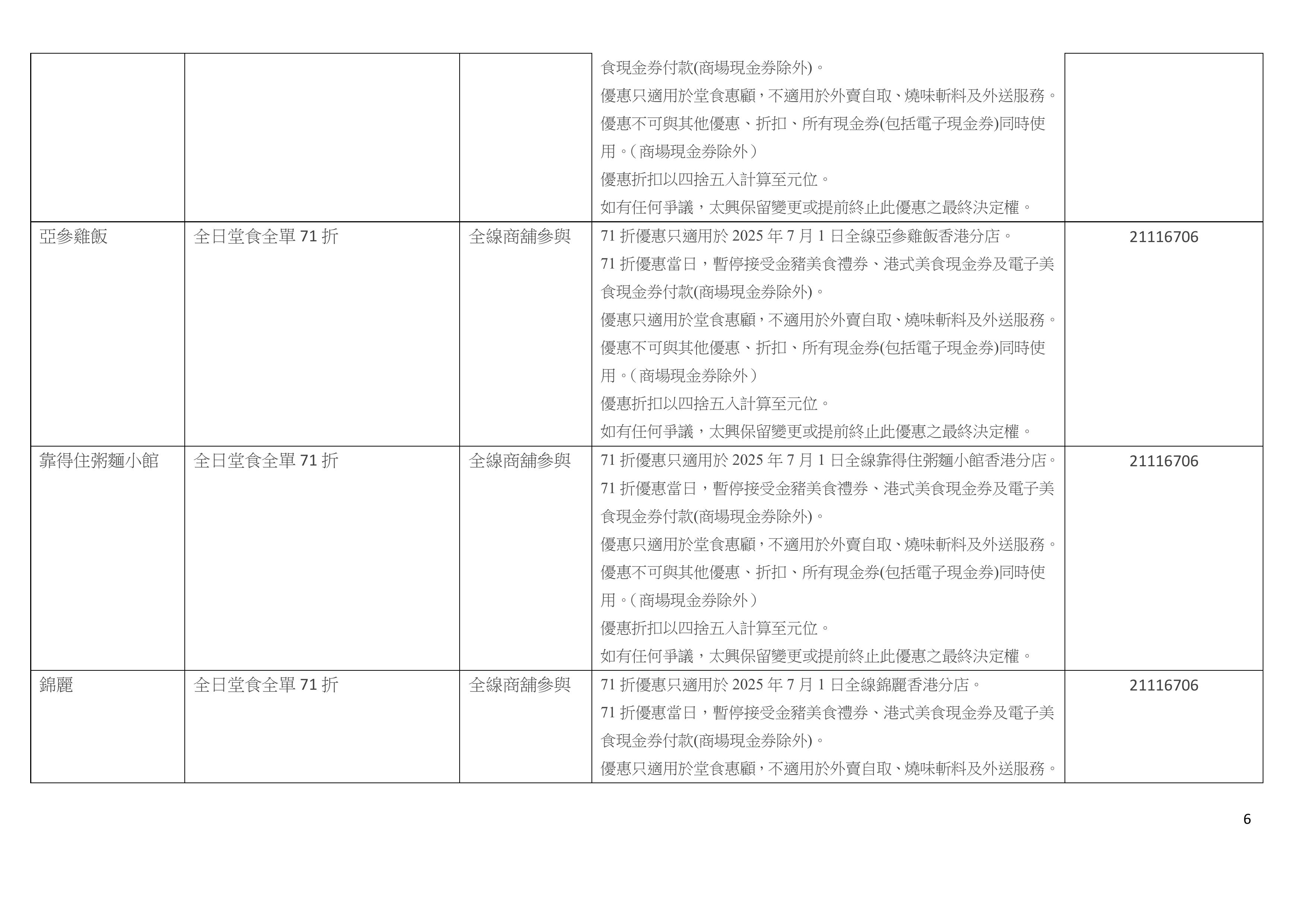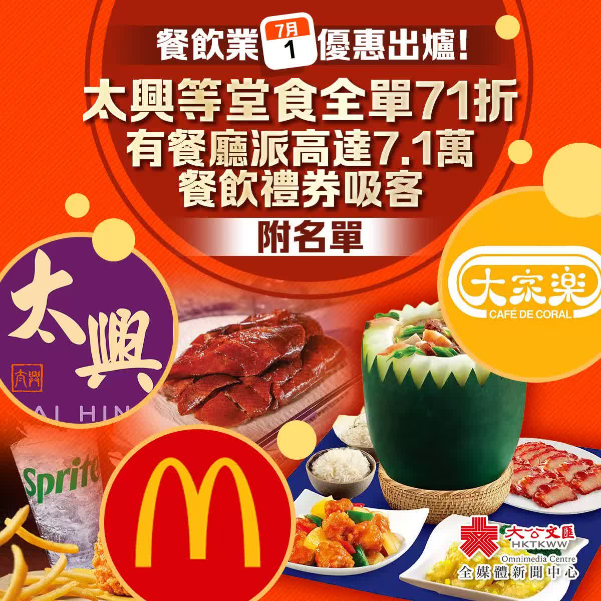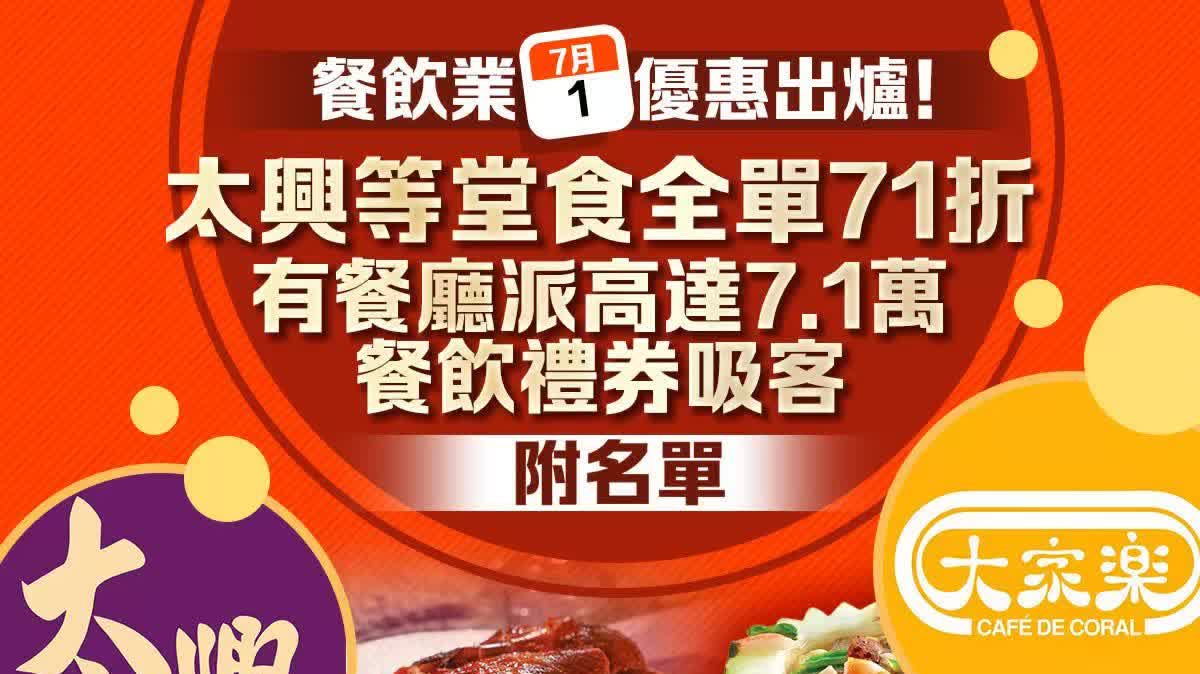 另外,太興集團旗下16個品牌將推出全日堂食全單71折;全線大快活將於本月28日至7月4日推出指定晚市2人餐71折優惠。