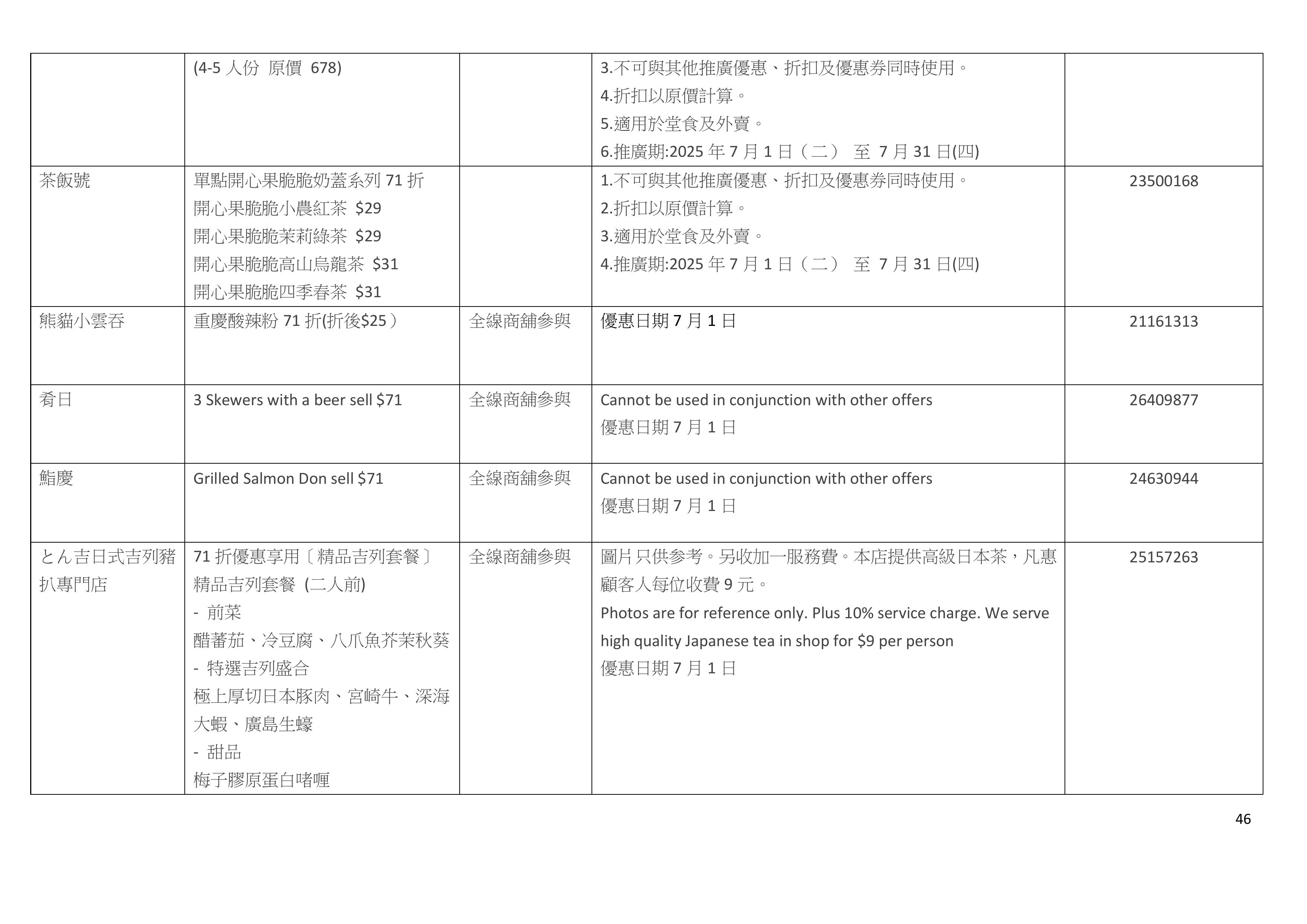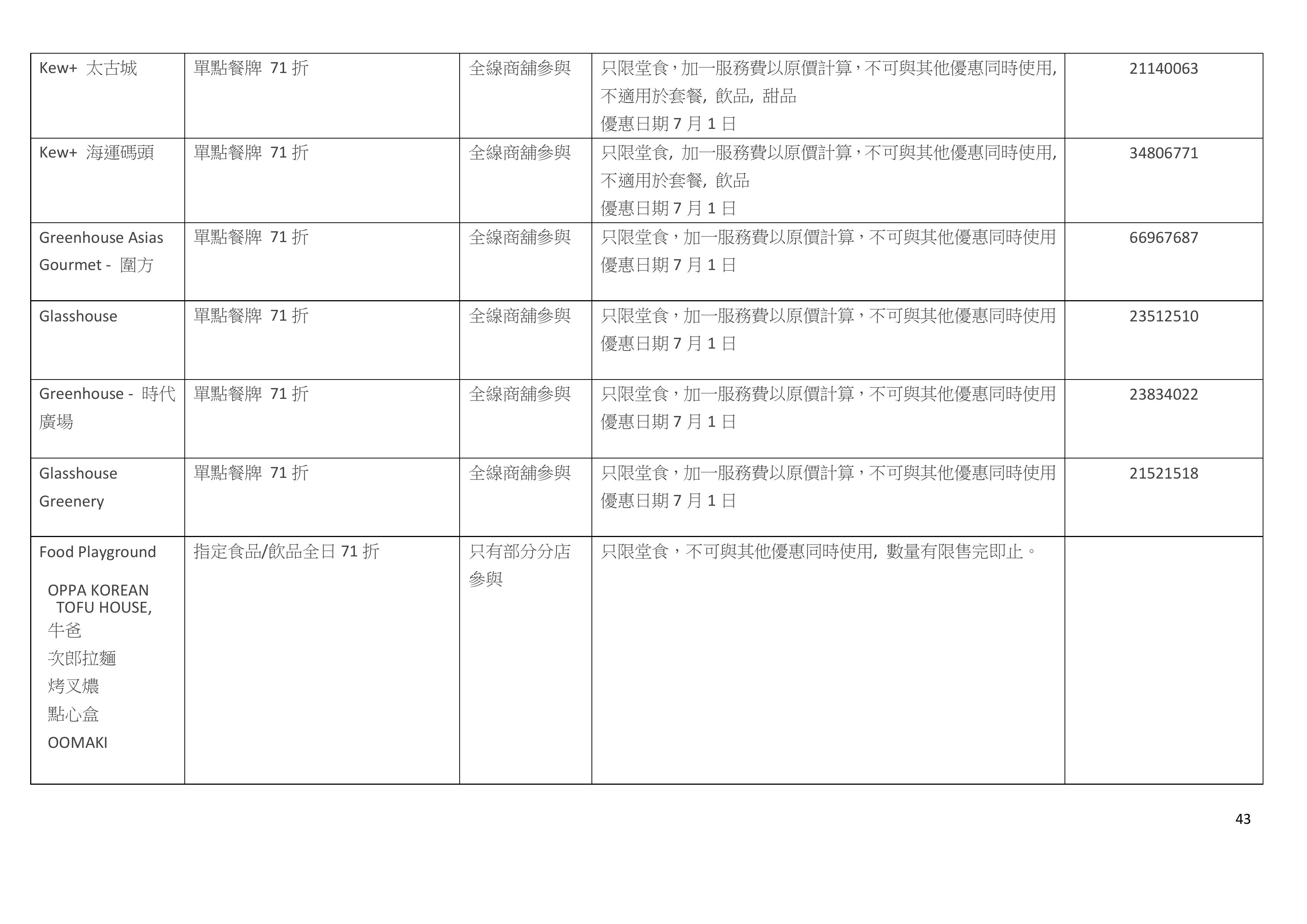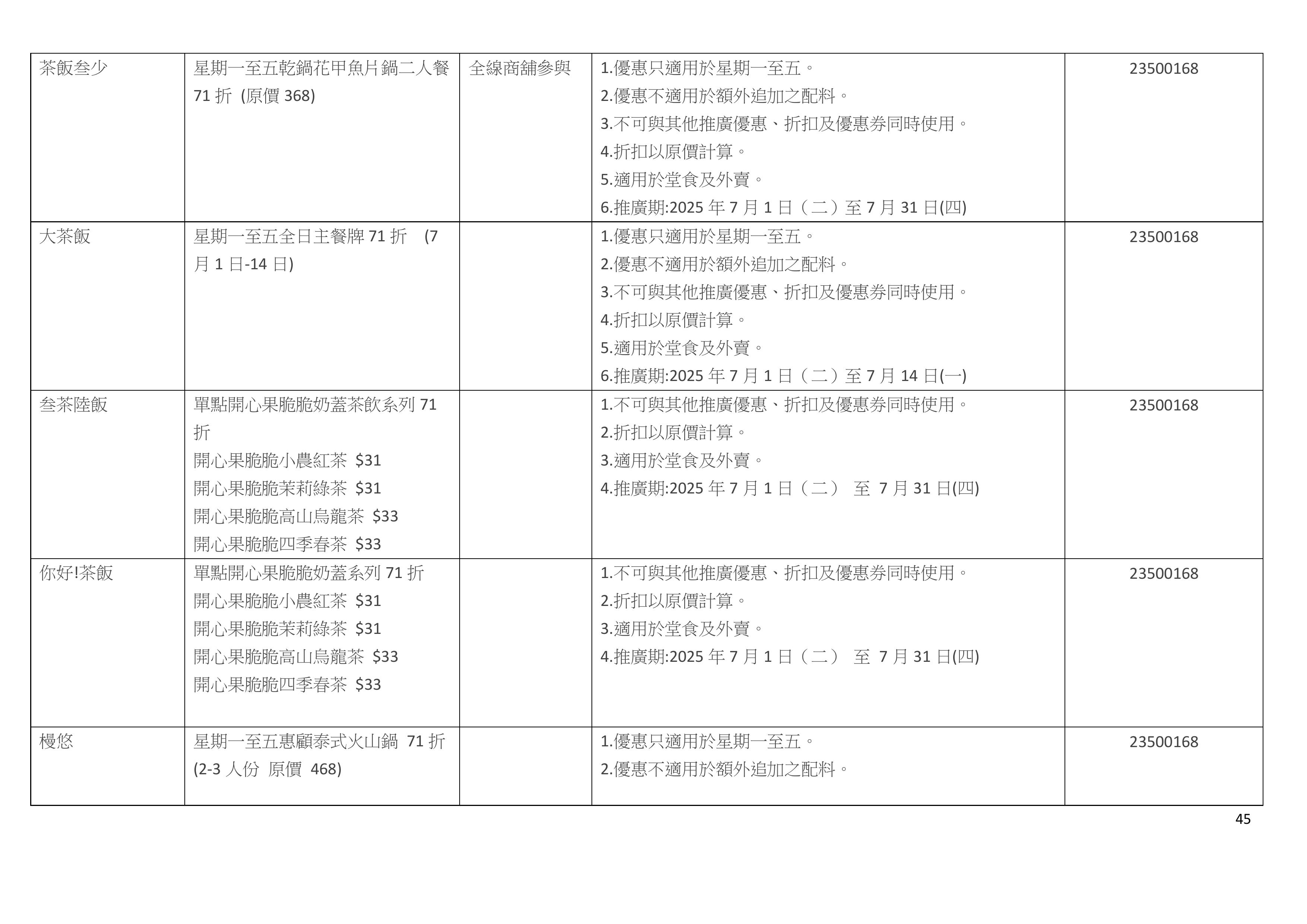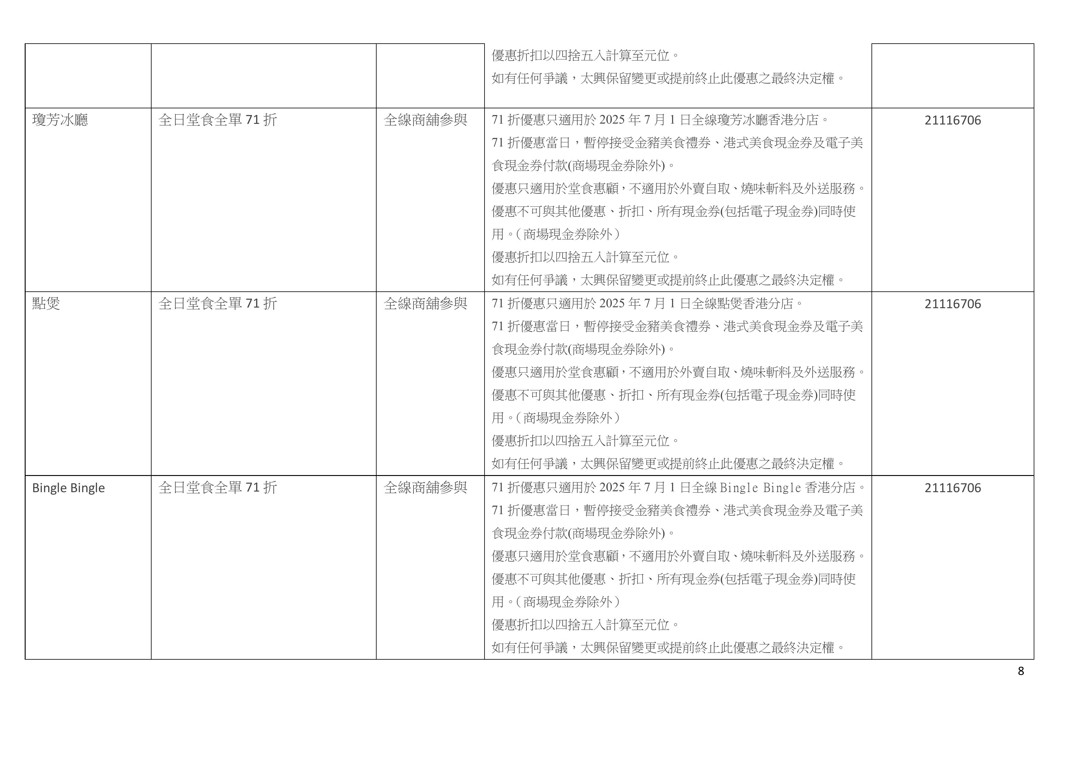 另外,太興集團旗下16個品牌將推出全日堂食全單71折;全線大快活將於本月28日至7月4日推出指定晚市2人餐71折優惠。