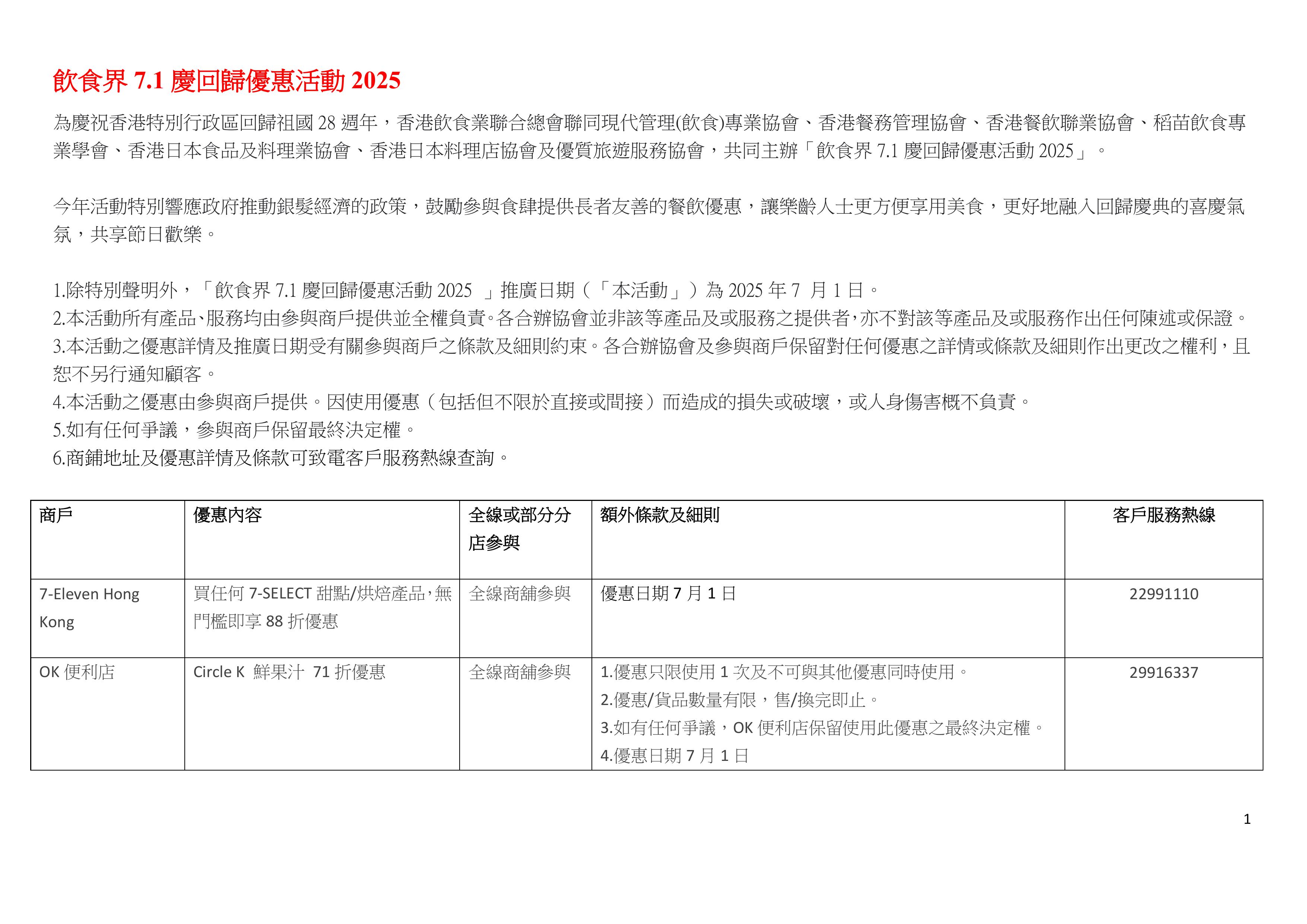 大公文匯全媒體報道,為慶祝香港回歸祖國28周年,飲食業界代表今日(25日)下午舉行記者會,講解業界舉辦七一餐飲優惠安排詳情。多間食肆、酒店及麵包店等商戶,推出堂食或部分商品享七一折優惠,有食肆當日會提供方便長者進食的餐飲,例如軟餐及甜品等,並有特別優惠。