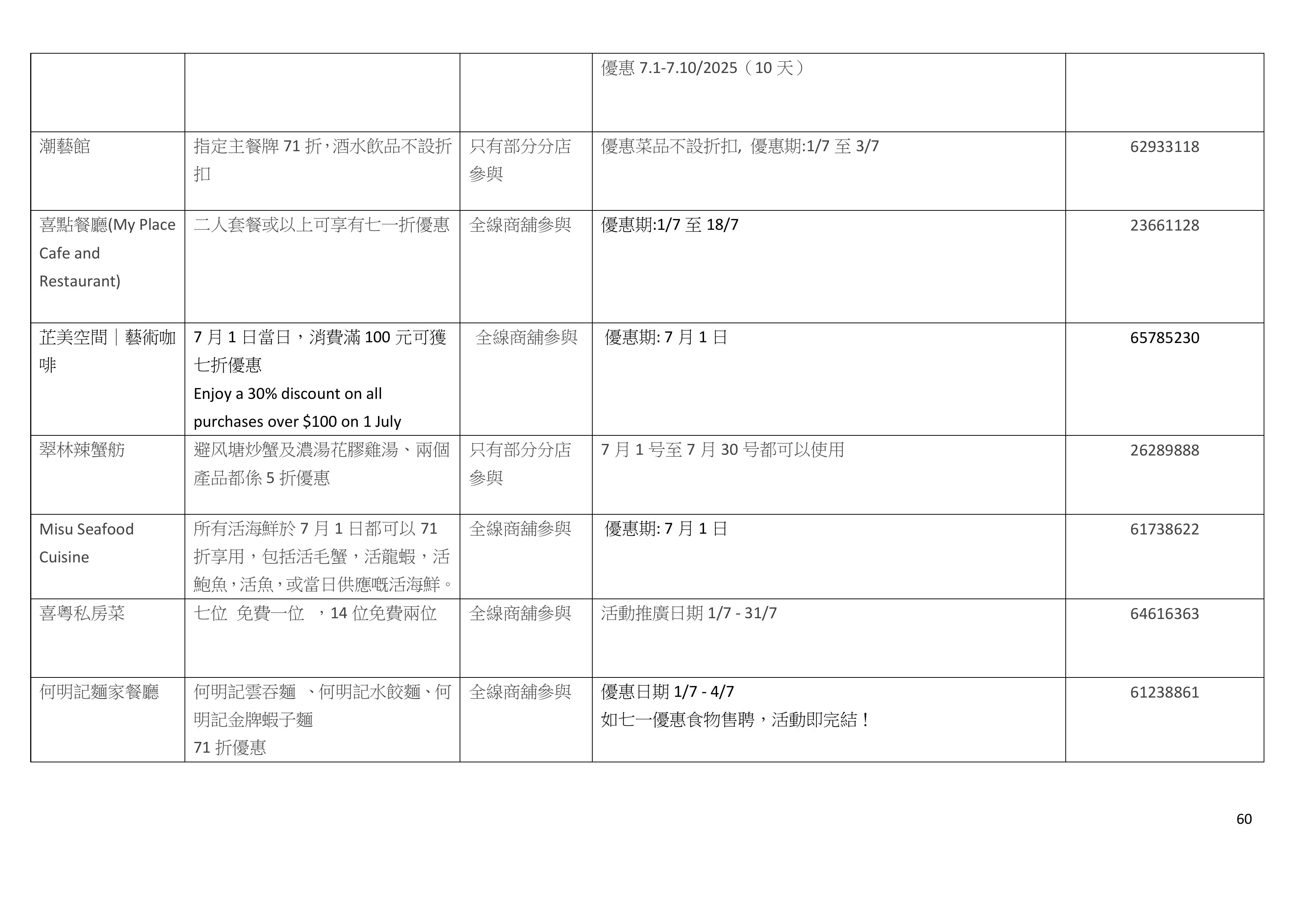 今年活動亦響應政府推動銀髮經濟的政策,鼓勵參與食肆提供長者友善的餐飲優惠,其中泰昌餅家部分分店推出71折優惠,凡出示長者咭或樂悠咭,惠顧正價產品滿10元或以上,可享71折;全線鍾菜館亦推出「同桌同餐吞嚥友善饗宴」71折優惠;全線包點先生及喜點亦推出優惠,出示樂悠卡或長者卡者,惠顧兩件任何款式的中式包類產品即可享有71折。