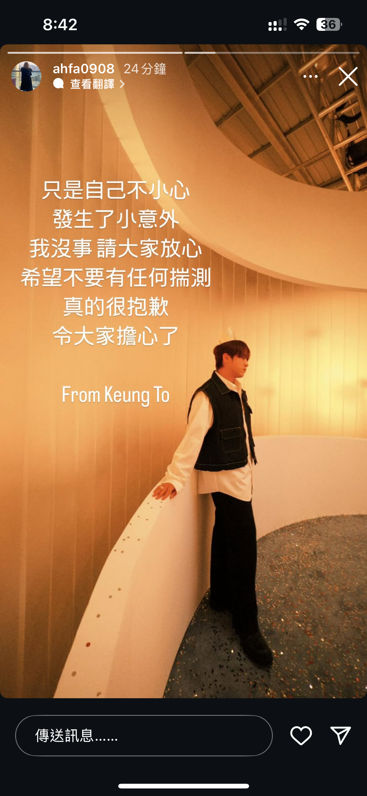 昨日墮海獲救後,姜濤借用經理人花姐IG報平安,指「只是自己不小心,發生了小意外,我沒事,請大家放心,希望不要有任何揣測,真的很抱歉,令大家擔心了」。