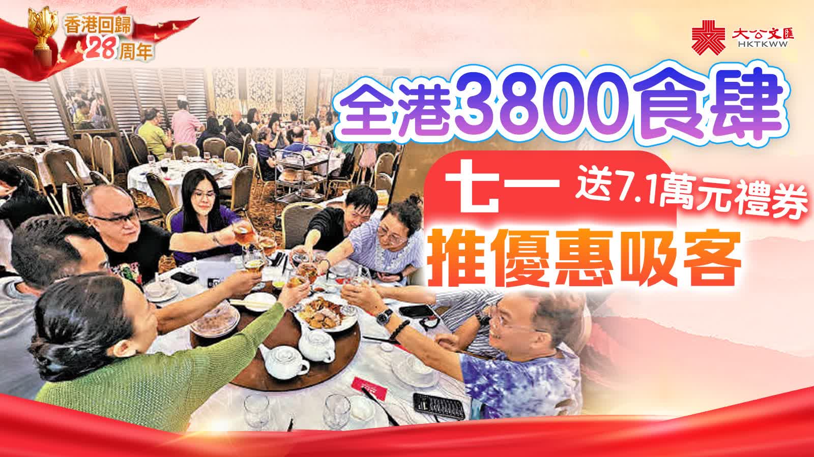 (大公報 記者 王亞毛)為慶祝香港回歸祖國28周年,政府和社會各界將提供一系列優惠及舉辦慶祝活動,餐飲業界昨日公布優惠詳情,全港約3800間食肆、酒店等,將在七月一日前後推出不同折扣的七一優惠,包括太興、敏華冰廳各大連鎖餐廳,以及富豪酒店餐廳等繼續推出全日堂食71折,部分餐廳優惠更自月初延續至7月底。