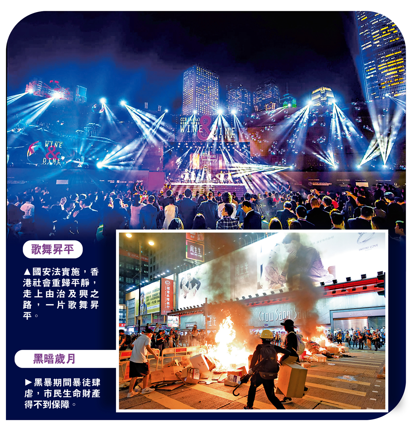 在那一段香港至暗時刻,晚上八時港鐵停止服務、商舖關門不做生意、開車要交「過路費」、承認自己是中國人需要視死如歸的勇氣、穿什麼顏色的衣服關乎生死……暴徒破壞法治、踐踏人權,對持不同意見人士當街執行「私刑」,打砸新聞機構、投擲汽油彈,更出現火燒活人、飛磚殺人等恐怖行徑。