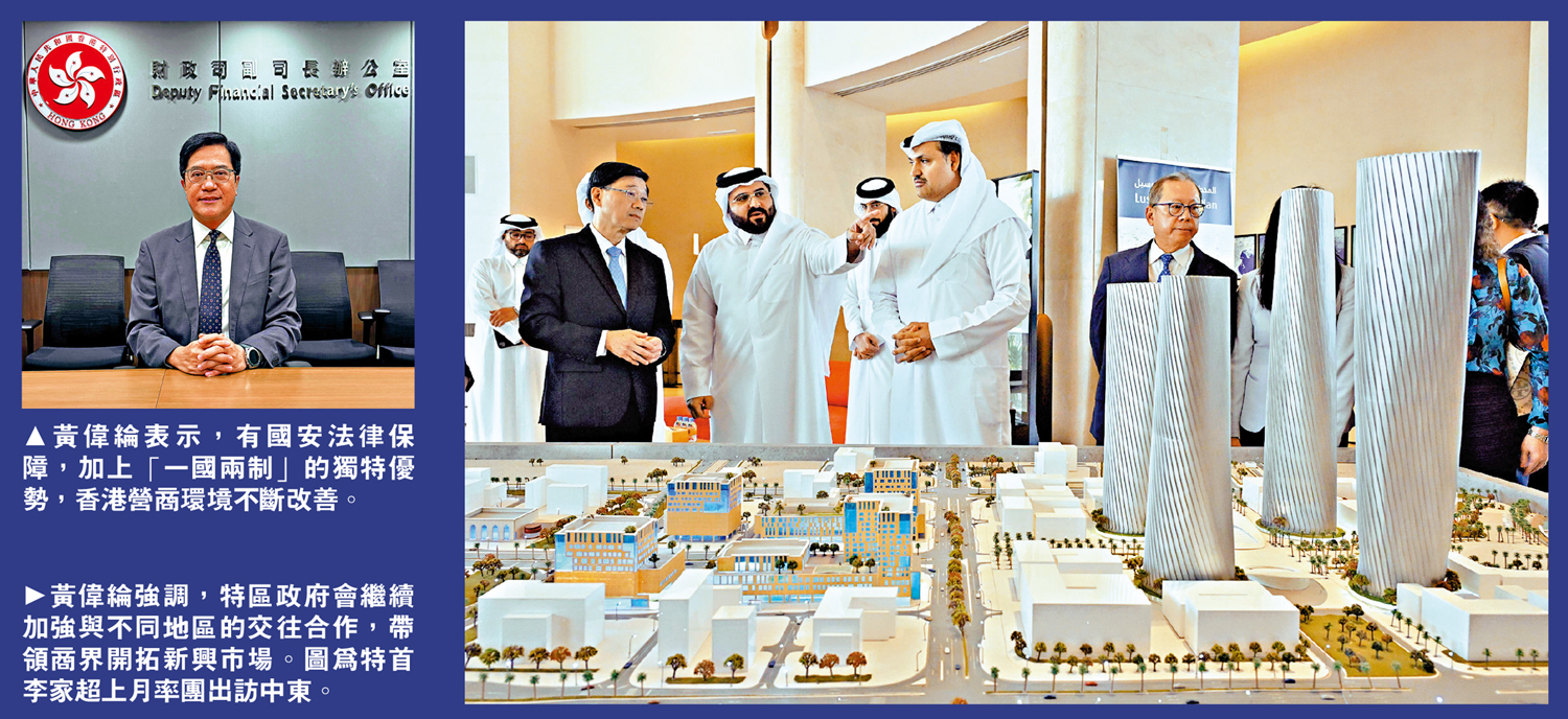 黃偉綸表示,有國家安全法律保障,加上「一國兩制」的獨特優勢,營商環境不斷改善,外國企業對香港的發展有信心。他舉例指,2024年,有香港境外母公司的駐港公司數目大幅增長,總數達9960間,較2023年上升10%。