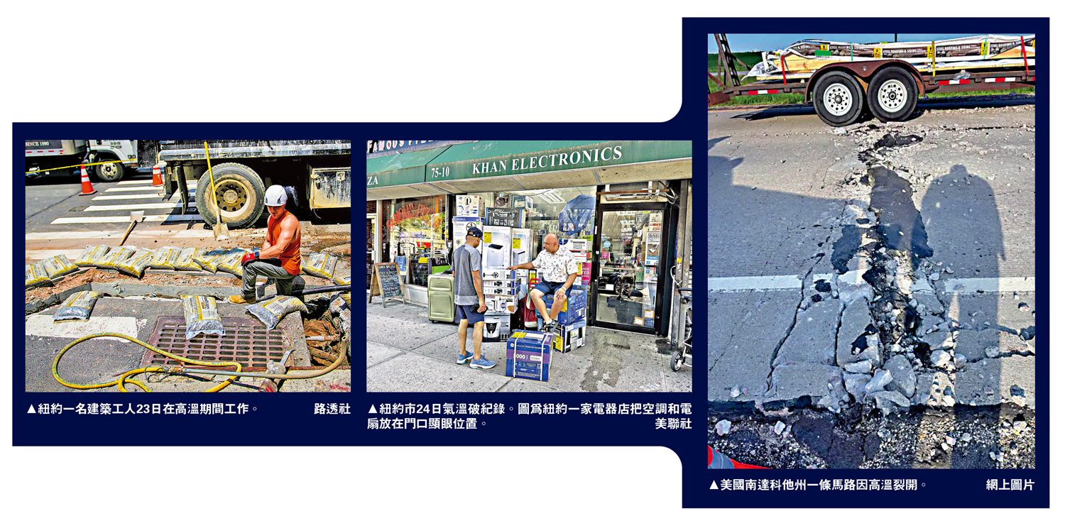 大公報綜合報道,極端熱浪近日席捲美國東北部,華盛頓、紐約、波士頓等地午後氣溫飆升至38℃以上,全美近1.6億人處於高溫警報中。高溫導致美國多地多條道路的路面裂開,鐵路系統被迫實施限速措施,導致多班列車延誤,美國基建問題再受關注。另外,高溫引發廣泛健康警報,全美有數百人因高溫中暑入院治療。