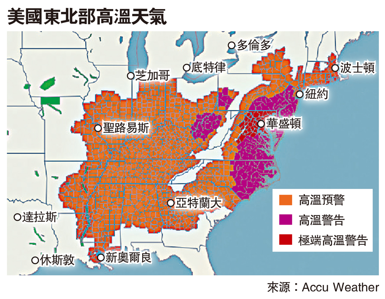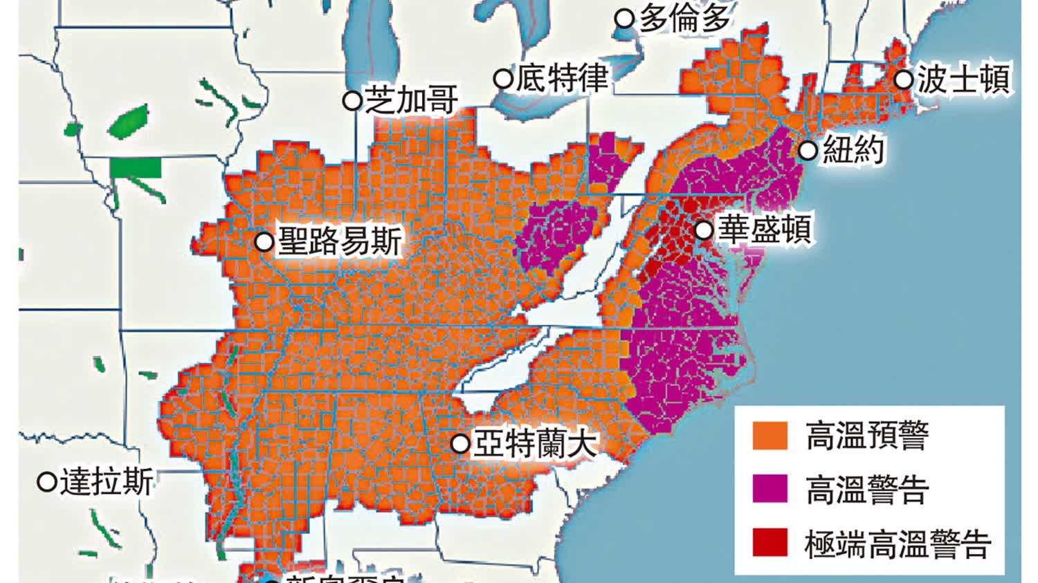 美國本輪高溫天氣始於上周末,比往年提前,尚未踏入7月,美東多地已發出極端高溫警告。美國國家氣象局在高溫警報中說,「中西部和東海岸持續出現極其危險的高溫天氣……約1.6億、即近一半美國人受到影響」,影響至少29個州。
