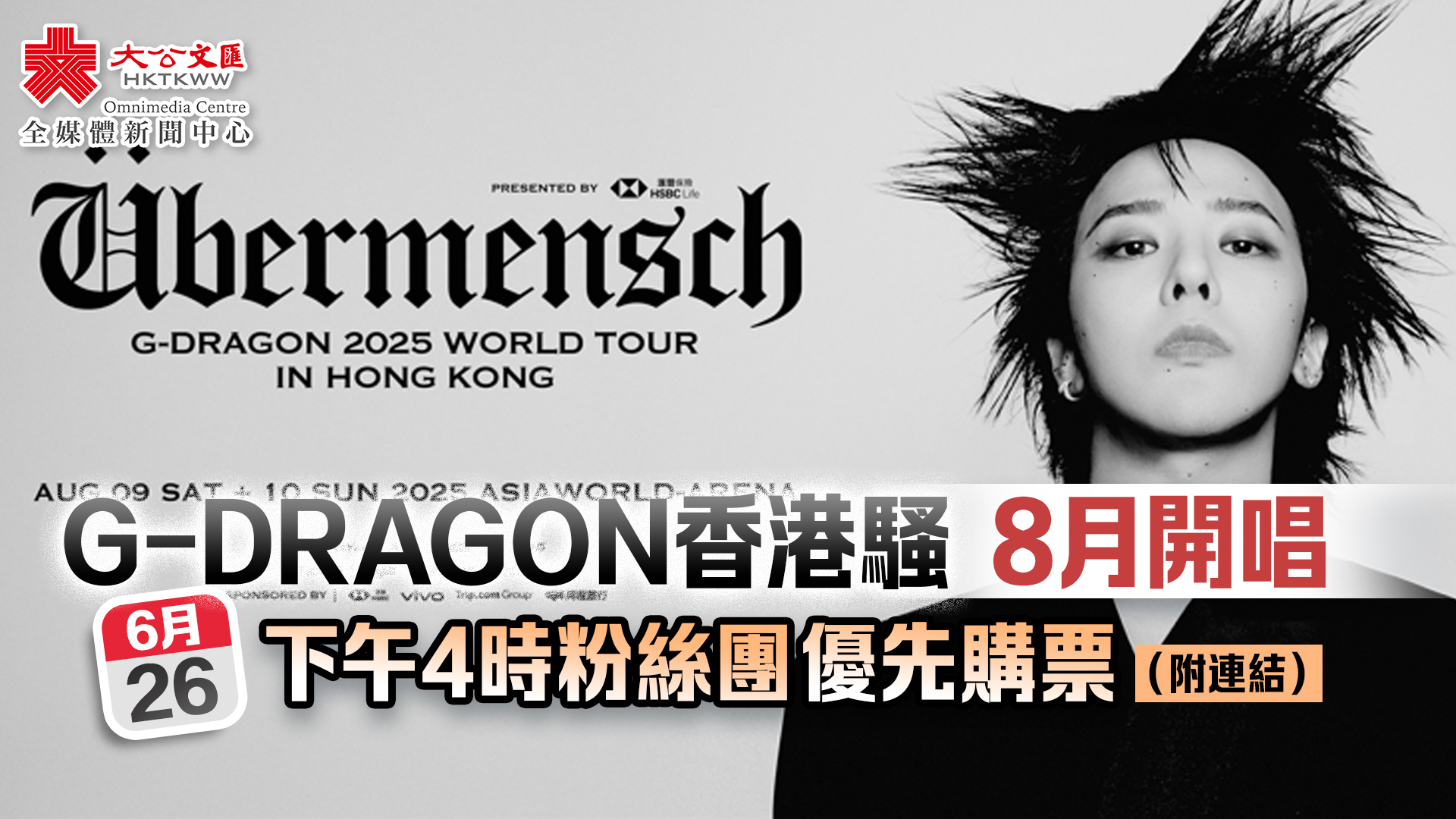 大公文匯全媒體報道,韓流天團BIGBANG的隊長G-Dragon(GD、權志龍),將於8月9至10日(星期六及日)在香港亞洲國際博覽館一連舉辦兩場演唱會。粉絲團優先購票將於今日(26日)下午4起在Cityline發售。