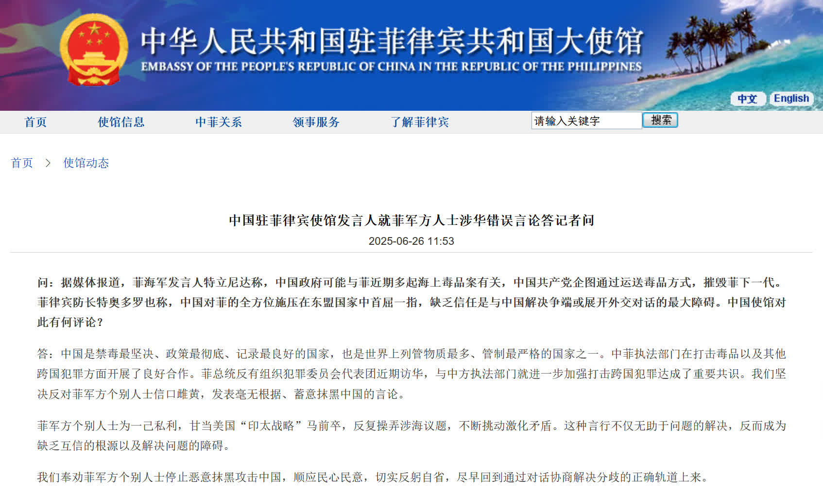 據中國駐菲律賓大使館消息,6月26日,中國駐菲律賓使館發言人就菲軍方人士涉華錯誤言論答記者問。