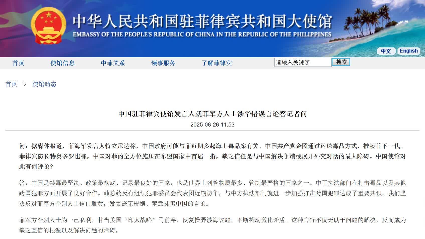駐菲律賓使館發言人表示,中國是禁毒最堅決、政策最徹底、記錄最良好的國家,也是世界上列管物質最多、管制最嚴格的國家之一。中菲執法部門在打擊毒品以及其他跨國犯罪方面開展了良好合作。菲總統反有組織犯罪委員會代表團近期訪華,與中方執法部門就進一步加強打擊跨國犯罪達成了重要共識。我們堅決反對菲軍方個別人士信口雌黃,發表毫無根據、蓄意抹黑中國的言論。