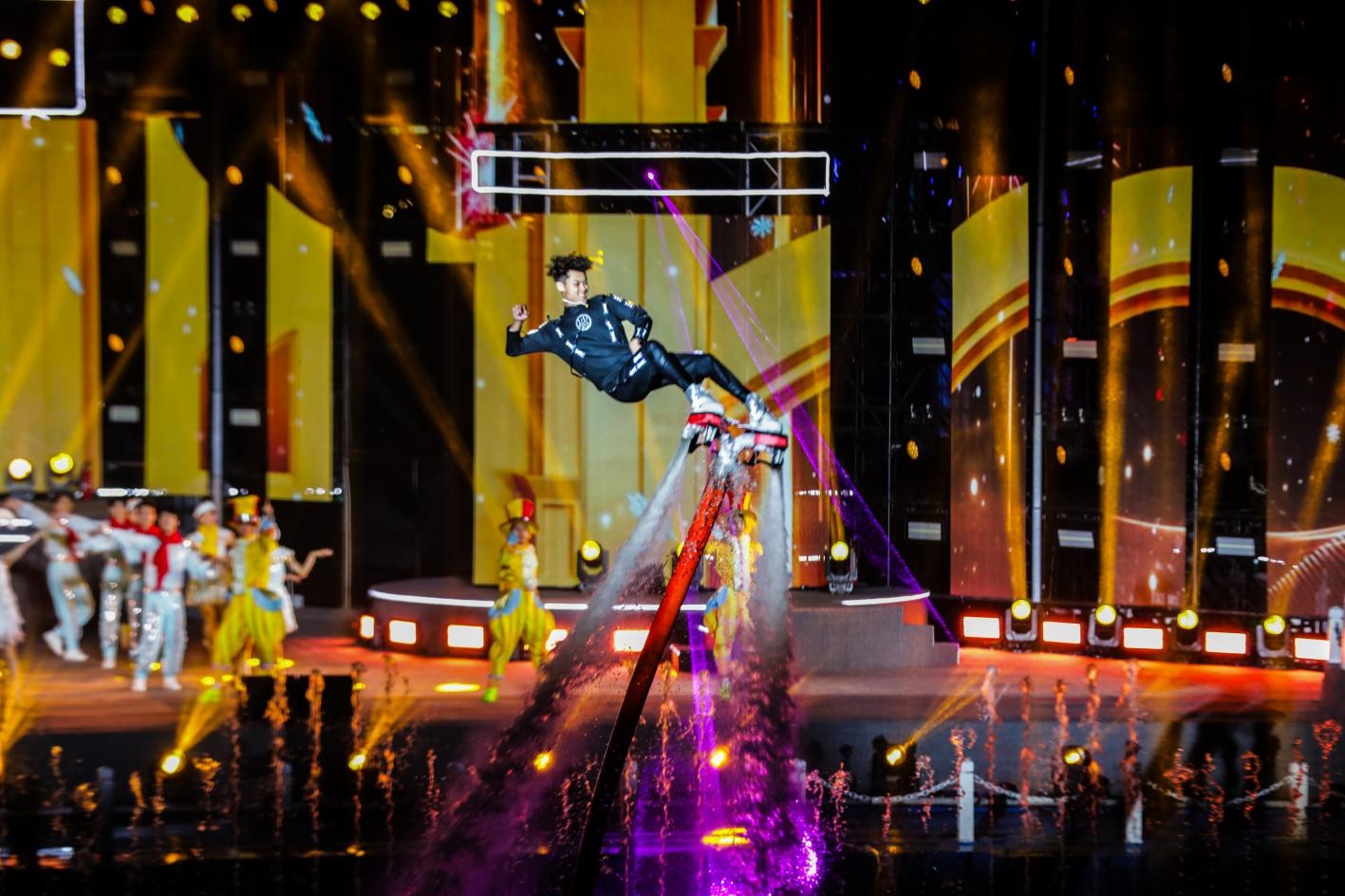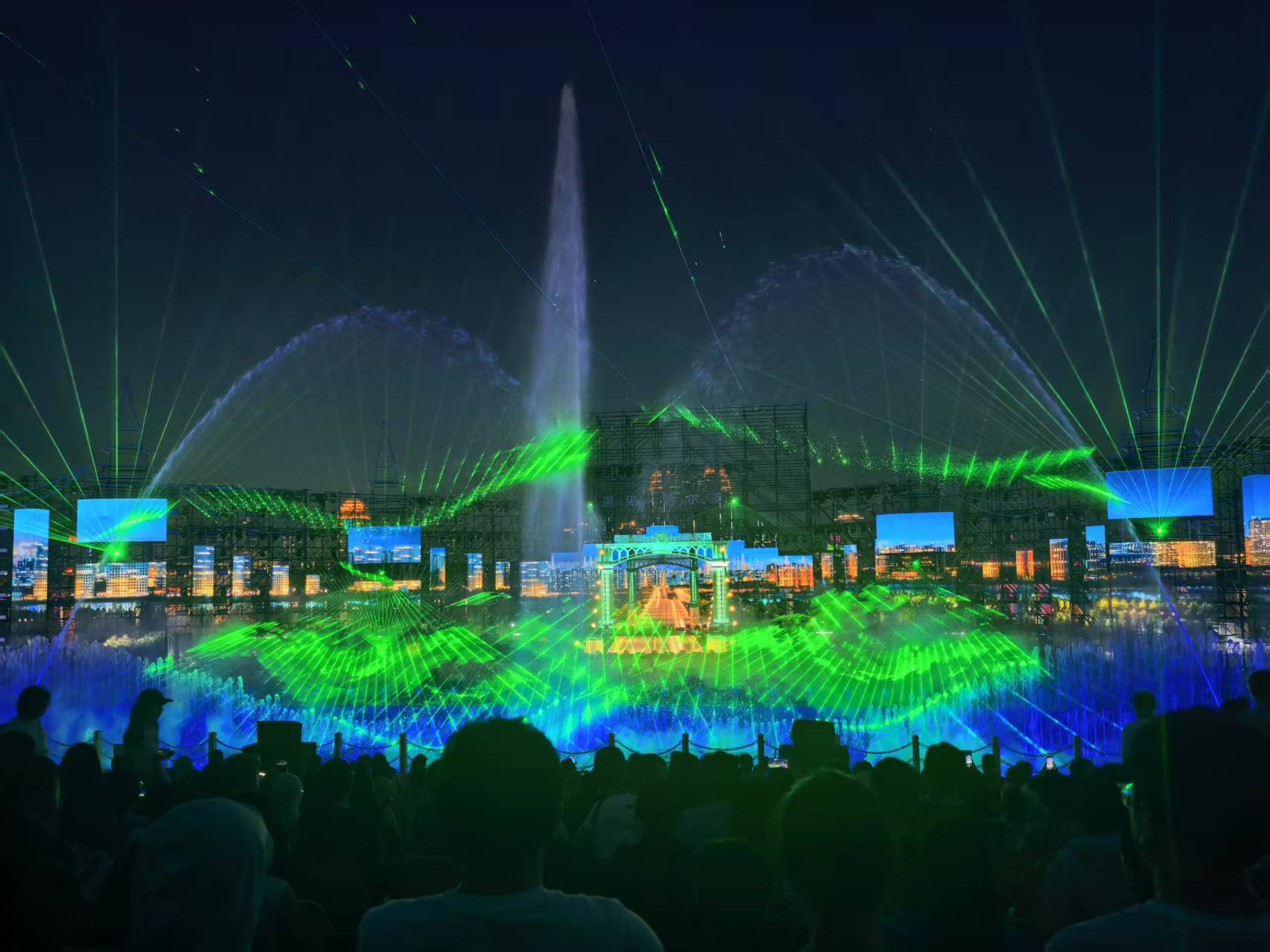 夜幕降臨,松花江江面瞬間化作光影的畫布。綵排現場,水幕、噴泉、激光秀、無人機等特效輪番登場,交相輝映;光影與旋律交織,歷史故事通過鮮活的影像在觀眾眼前徐徐展開。演員們精湛的表演,配合着「人、聲、光、水、電、影、景」的深度融合,讓整個演出現場充滿了震撼力與感染力。