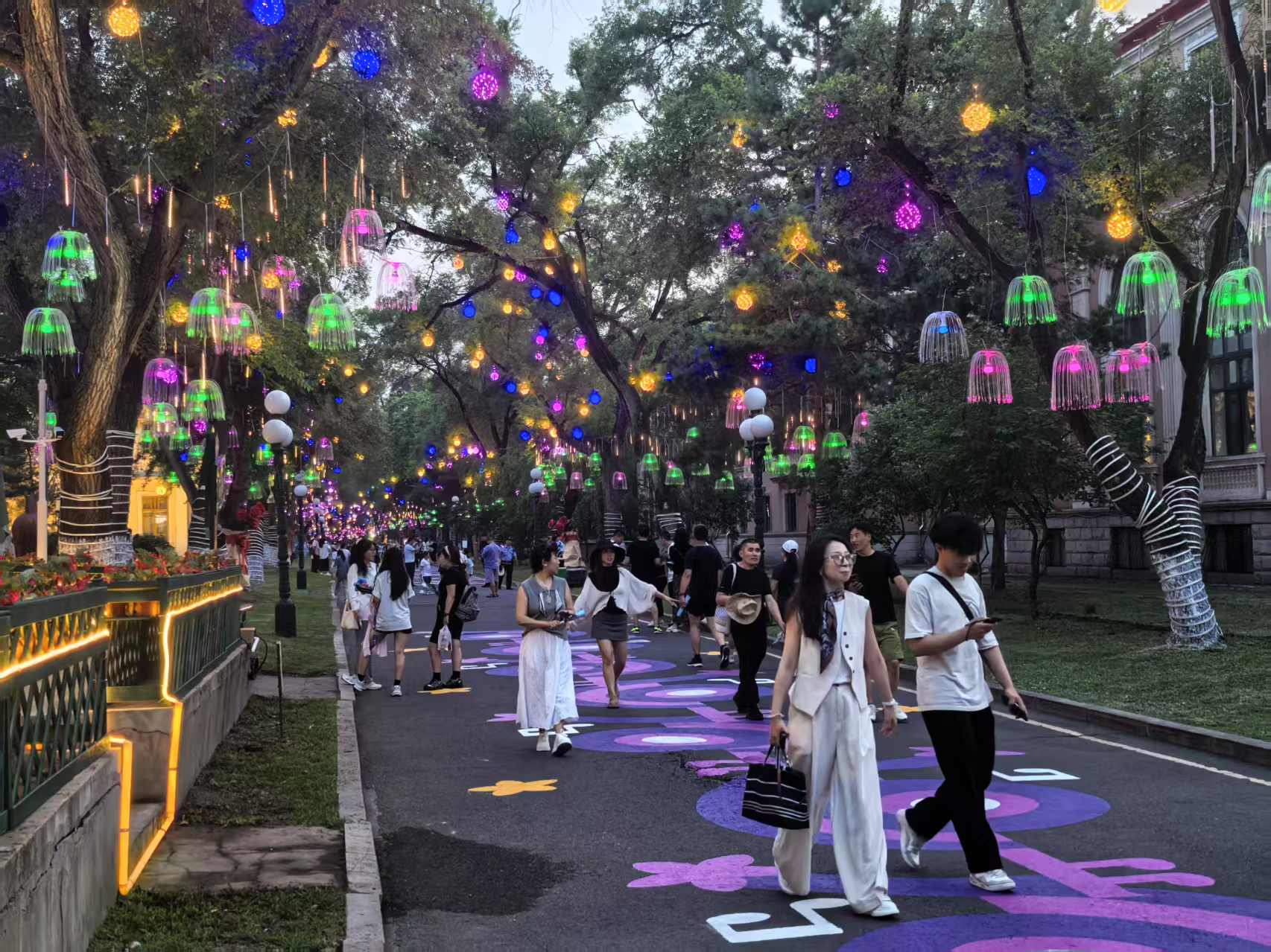 傍晚時分,通往演出現場的《遇見·哈爾濱》網紅街,也吸引了眾多遊客駐足打卡。整條街道的地面,通過彩繪表現「浪漫」「愛情」和「遇見·哈爾濱」三大主題,滿是手繪的愛心和繽紛花朵,路兩旁的樹上還精心布置了玫瑰花束和水母燈,直接將浪漫值拉滿。遊客們擺出或站、或坐、或跳起等姿勢,無需修圖,隨手一拍都是浪漫大片。網紅街不僅好拍,更精彩、好看。