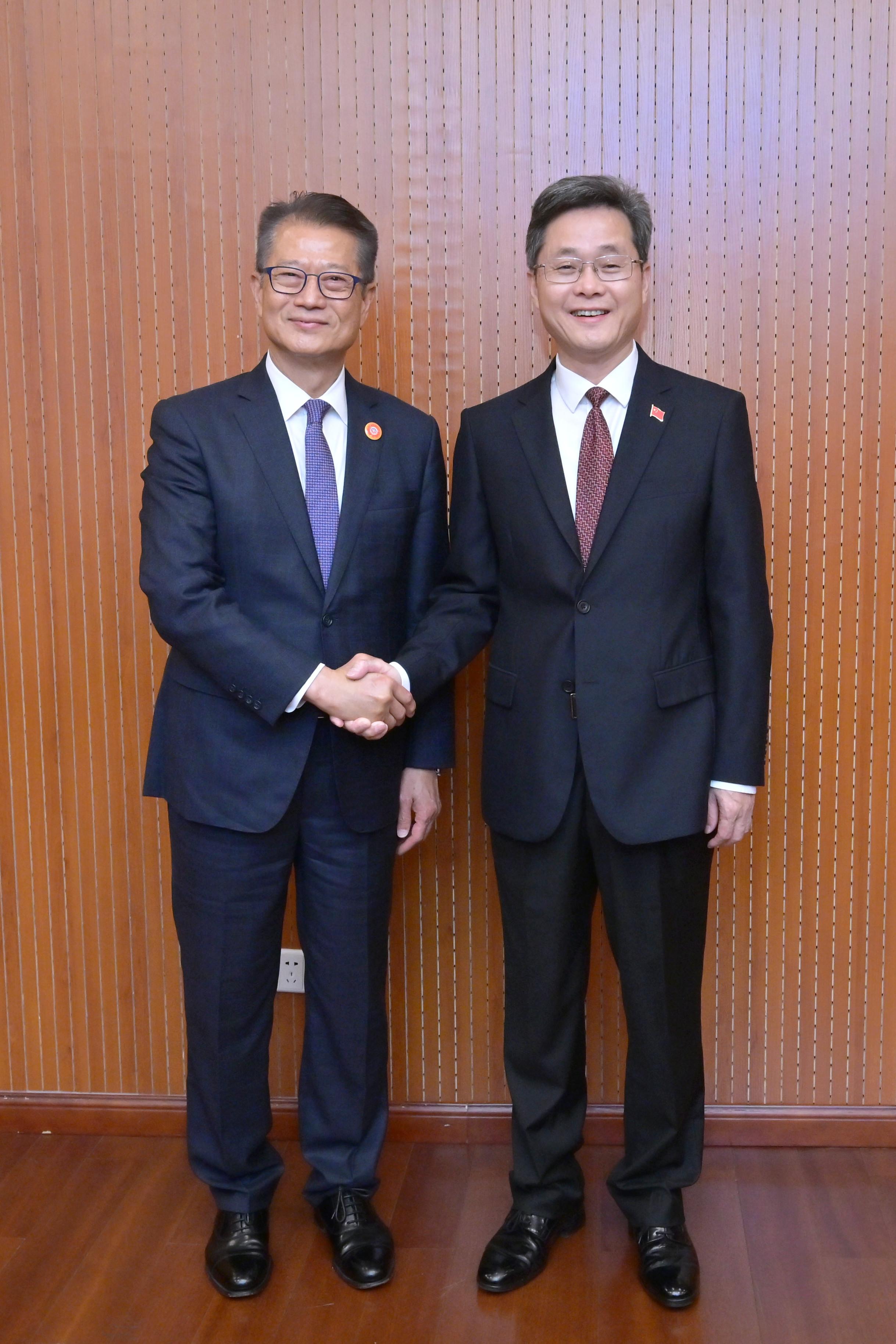 陳茂波其後拜會了財政部部長藍佛安,雙方就內地和香港的經濟及社會發展情況深入交流。陳茂波向藍佛安介紹了香港近一年多來在金融、貿易、創科、吸企業、引人才,以及公共財政等方面的情況,並指出在國家的堅實支持、中央各部委和國家財政部的大力支持配合下,香港經濟穩步向前、金融市場興旺、國際投資者的信心正在增強。特區政府將繼續全力聚焦發展經濟、改善民生。他又表示支持國家在香港更多發行人民幣國債,並正着力通過提升人民幣的流動性、豐富投資產品和風險管理工具,以及提升金融基建等方面,構建更豐富蓬勃的離岸人民幣業務生態,助力穩慎推進人民幣國際化。
