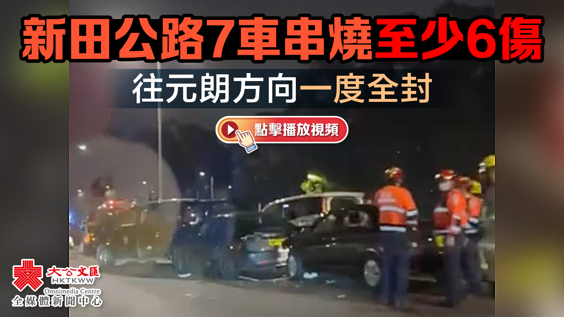 大公文匯全媒體報道,今日(26日)晚上約8時,新田公路往元朗方向近錦繡花園發生車禍,7輛私家車連環相撞,致至少6人受傷,幸而傷者均保持清醒。警方及消防人員接報後迅速到場救援,車禍原因仍在調查中。