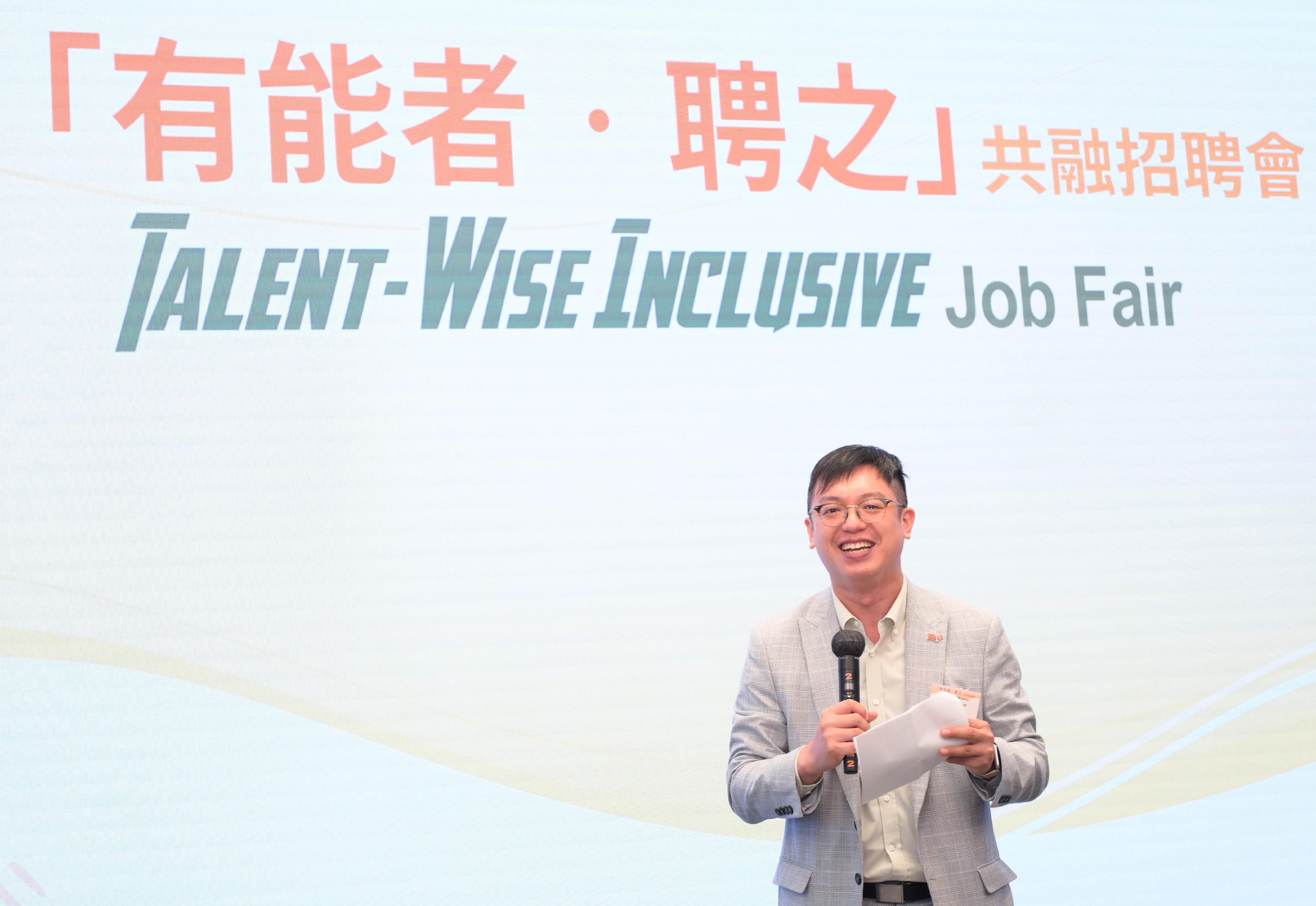 招聘會只是鼓勵和支援殘疾人士就業的一部分工作,政府亦另設「愛心僱主」獎章,表揚積極聘請殘疾人士的僱主。我知道在座一些僱主已經率先報名參加,希望大家給予掌聲。沒有他們的支持,活動無法順利舉行。希望大家再接再厲,多向社會推廣傷健人士具備的各種才能,值得大家聘用。在座未報名的朋友仍有機會,報名截止日期是七月四日,大家謹記盡快報名,參與「愛心僱主」獎章,攜手為香港打造「多元才能‧共融職場」。