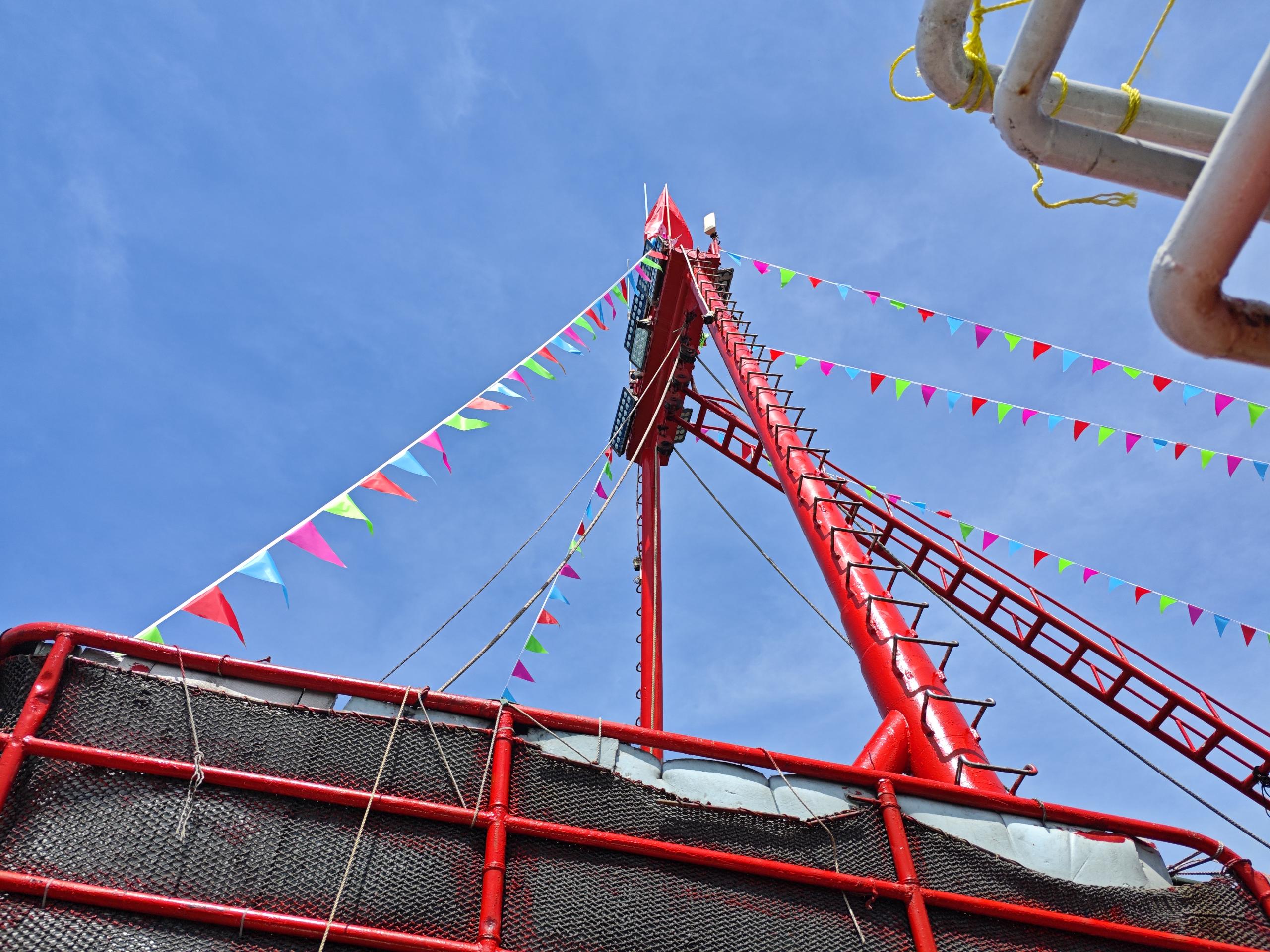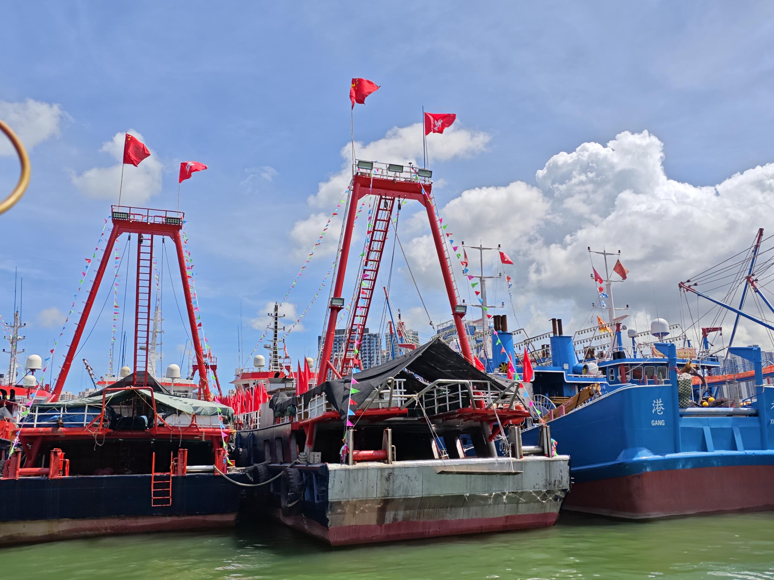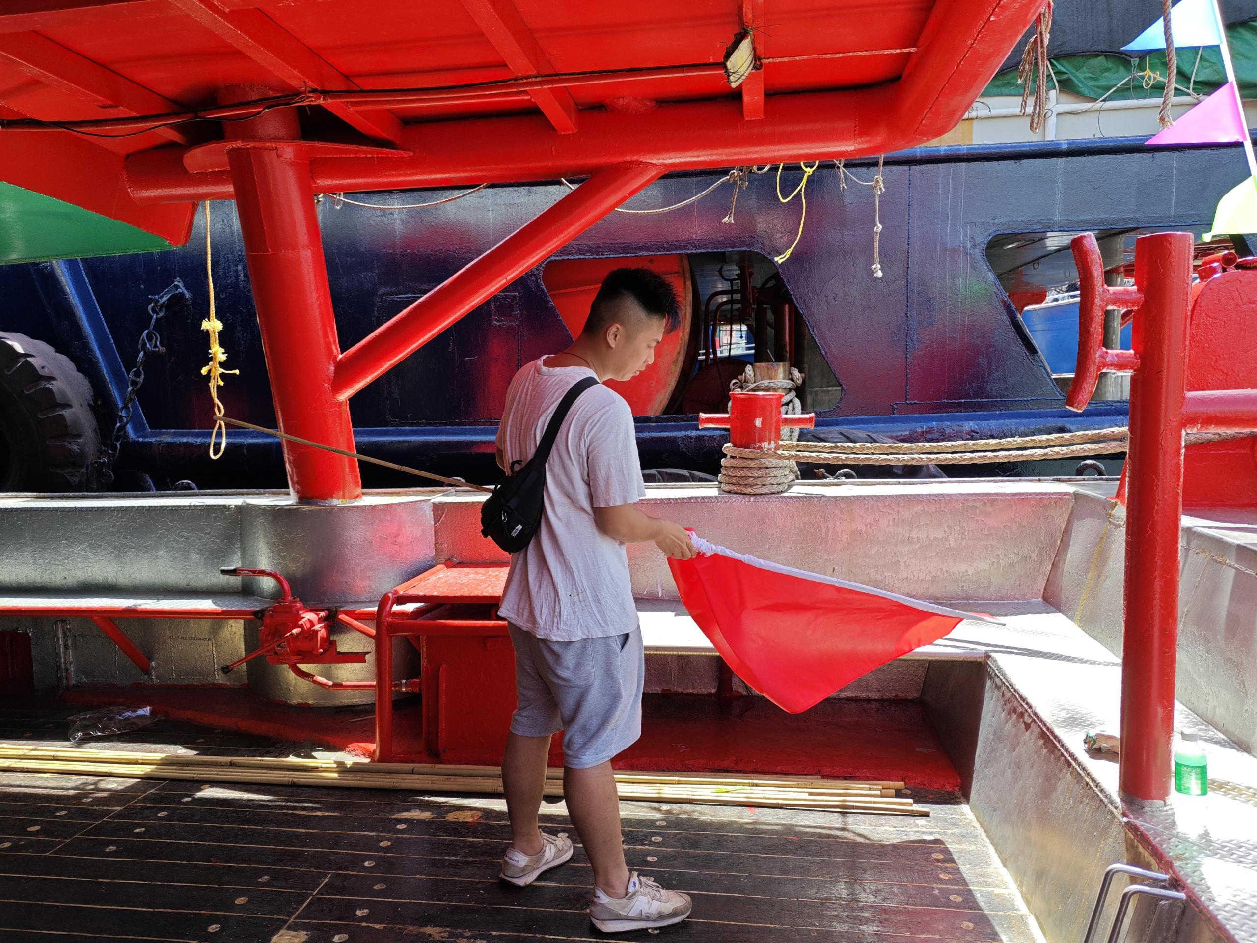 屯門避風塘海面上漁船彩旗飄揚、十分惹眼,記者在漁船甲板見到有多面刀旗以及慶祝橫幅等裝飾尚未掛上船身,漁民朋友也還在不停地向船上運送紅旗。據崔景恒介紹,巡遊將於維港展開,部分參與巡遊的漁船暫時停泊屯門,許多準備工作因擔心海水顛簸影響不能提前開展,將在臨近節慶時再做安排,力求以最佳狀態展示給市民。