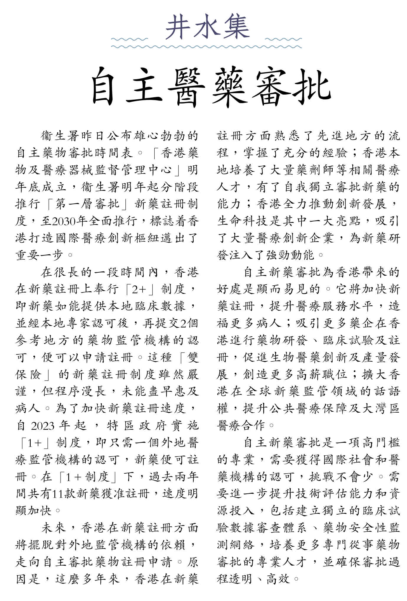 自主新藥審批為香港帶來的好處是顯而易見的。它將加快新藥註冊,提升醫療服務水平,造福更多病人;吸引更多藥企在香港進行藥物研發、臨床試驗及註冊,促進生物醫藥創新及產量發展,創造更多高薪職位;擴大香港在全球新藥監管領域的話語權,提升公共醫療保障及大灣區醫療合作。