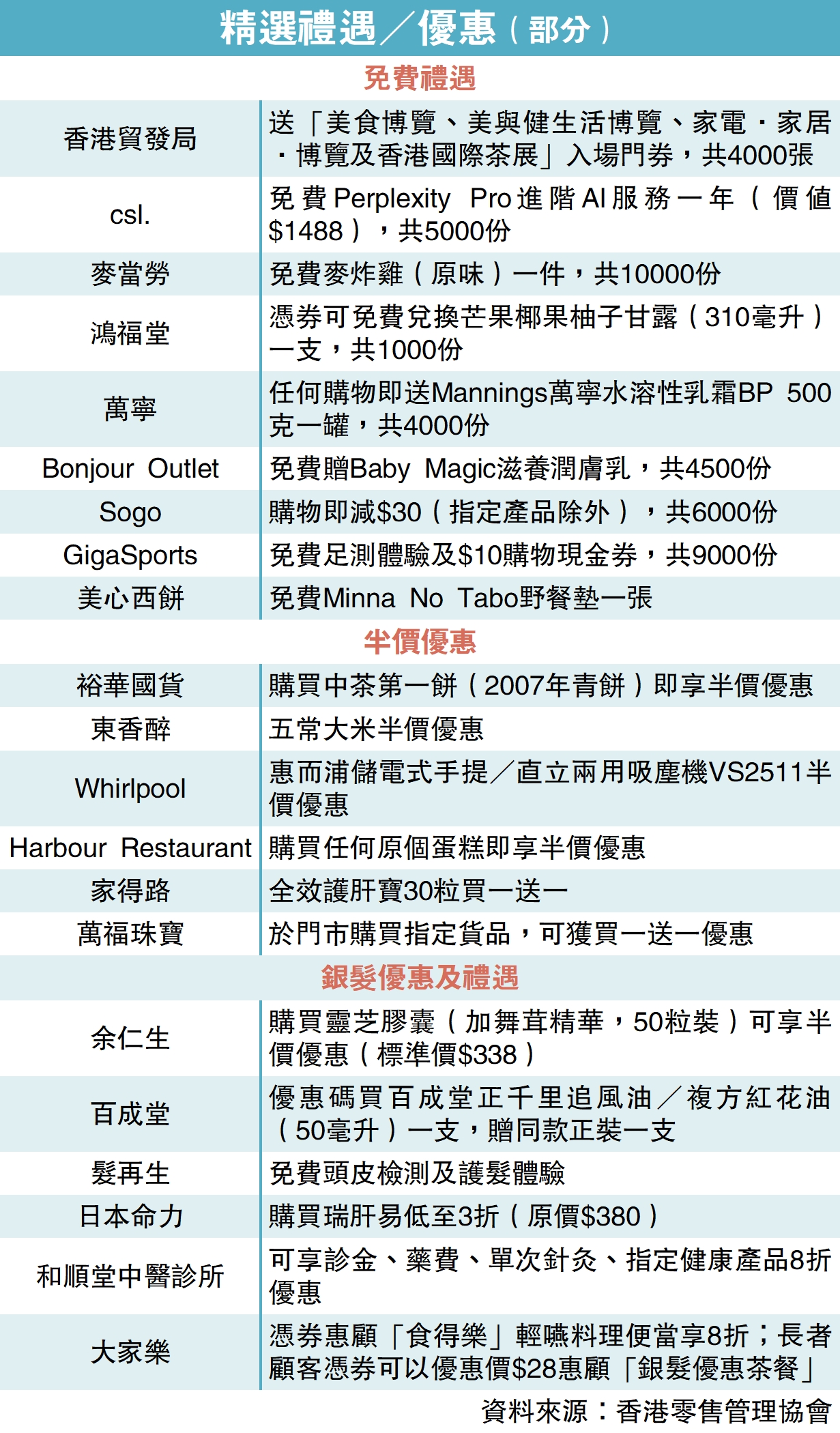 當中,麥當勞免費送出一萬件原味麥炸雞、美心西餅免費送野餐墊、MegaBox送30元美食現金券、於蛋撻王指定分店購買批類或撻類產品,可享買三送一優惠等。部分支付平台除了發放各參與商戶提供的優惠,更額外提供其平台優惠予消費者。