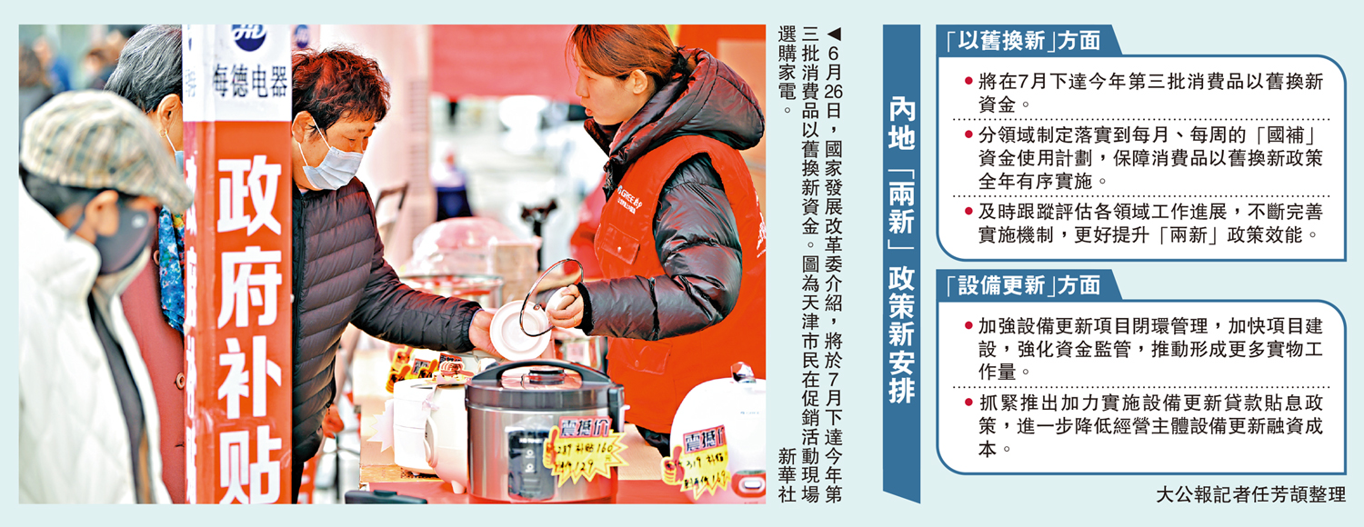 (大公報 記者 任芳頡 北京報道)6月26日,國家發展改革委政策研究室副主任李超在新聞發布會上表示,將於7月下達今年第三批消費品以舊換新資金,並按照「時序性」和「均衡性」原則,制定月度、周度「國補」資金使用計劃,確保政策全年有序實施。
