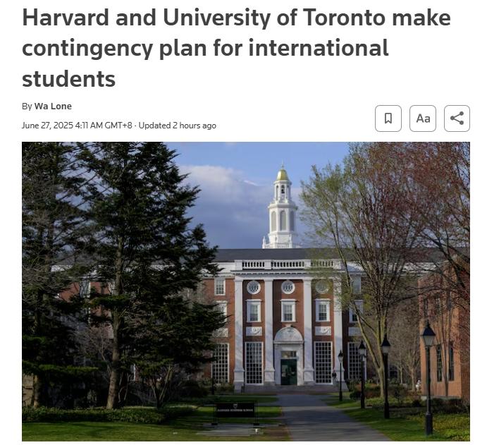 據中新網援引路透社26日報道,美國哈佛大學和加拿大多倫多大學公布了一項應急計劃,如果美國簽證限制阻止部分哈佛學生返回美國,他們將可以前往加拿大繼續學業。