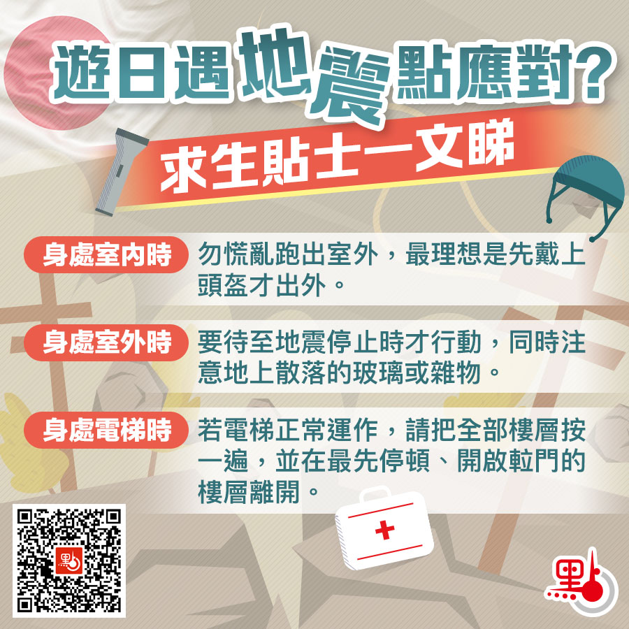 推薦閱讀:遊日遇地震點應對?可備便攜逃生包 求生貼士要牢記(附求助熱線)