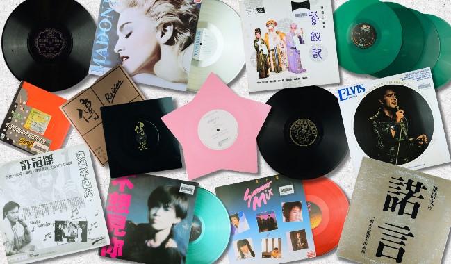 展出12張別注黑膠唱片——既有歷史感十足的蟲膠,亦有見證科技工藝進步的彩膠、圖案膠等珍貴版本。當中有少女感爆棚,粉紅星形的陳慧麗非賣品宣傳碟;外套以喜帖般銅金色印製,內藏正方形的Raidas黑膠宣傳碟;還有色彩別開生面的精選大碟——Madonna 1986年推出的透明膠碟;甄妮、蔡楓華等人夏日精選歌的紅色彩膠碟、盛載任白戲寶的四張厚重綠色彩膠……