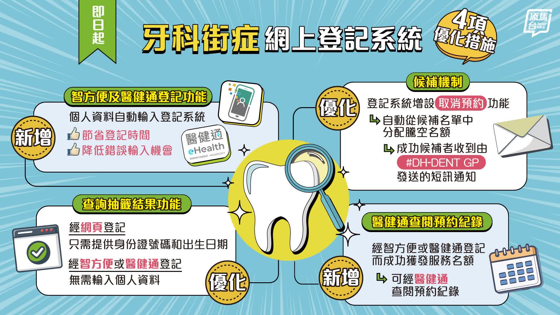 為簡化流程,並提升服務效率及用戶體驗,牙科街症網上登記系統推出四項優化措施。