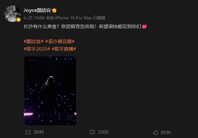 目前鄭欣宜已抵達長沙投入錄製,今晚將直播登台開唱。