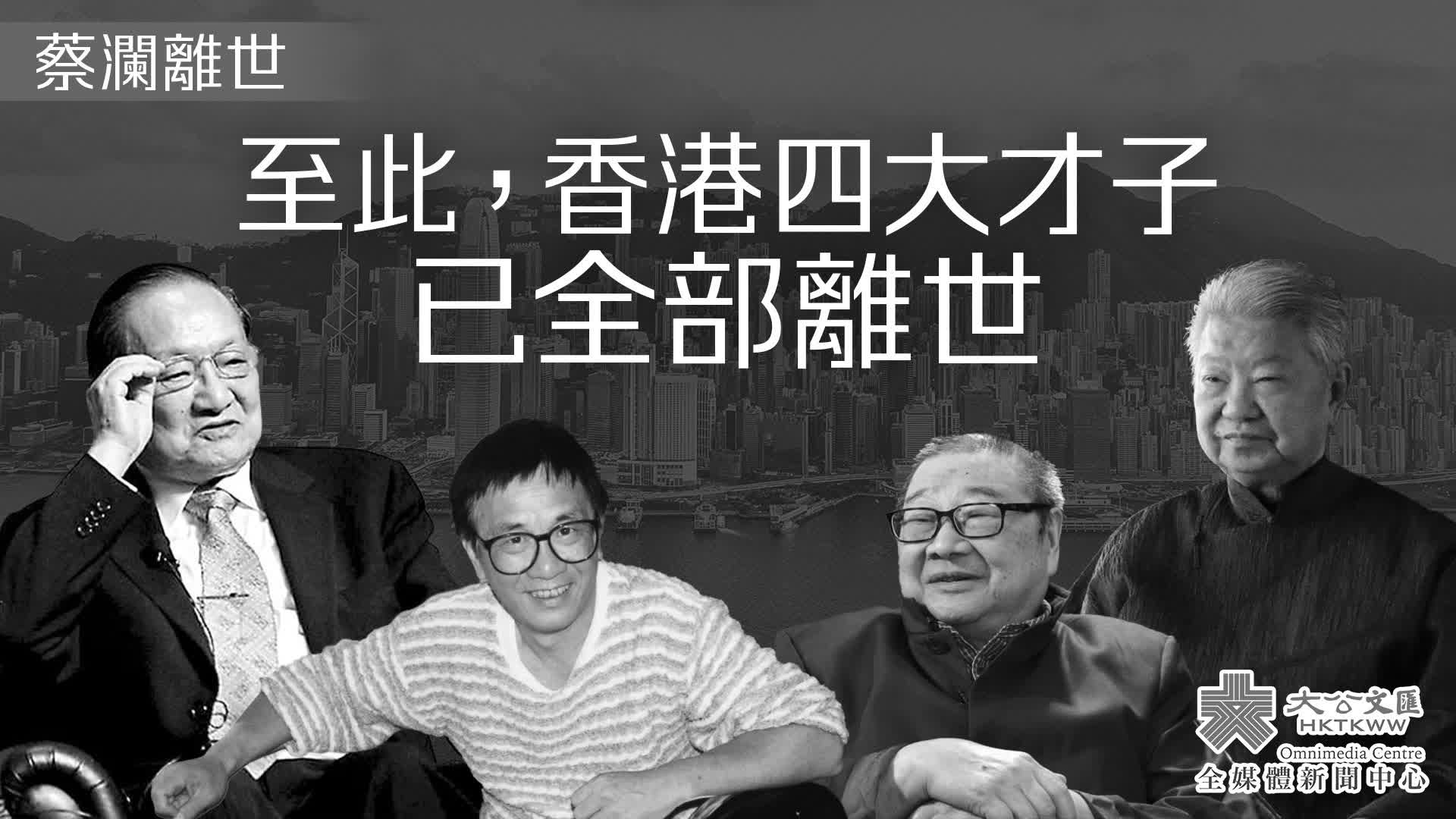 酒店窗外,海天浮光。他案頭有閒章,倪匡初識時送他的,上面刻着:少年子弟江湖老。蔡瀾曾與另兩位才子黃霑與倪匡曾經有個約定:「任何人先走都不會流淚」。在金庸患病時,他曾經為這位友人抄寫了100張《心經》,在倪匡離世前,他為對方搜羅全港最美味的肥叉燒。隨着其餘三位才子黃霑、金庸和倪匡已相繼仙遊,如今蔡瀾亦駕鶴遠去,標誌本港一個文化時代落幕。如今,四大才子天國重聚。