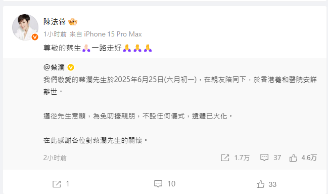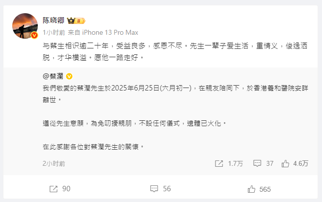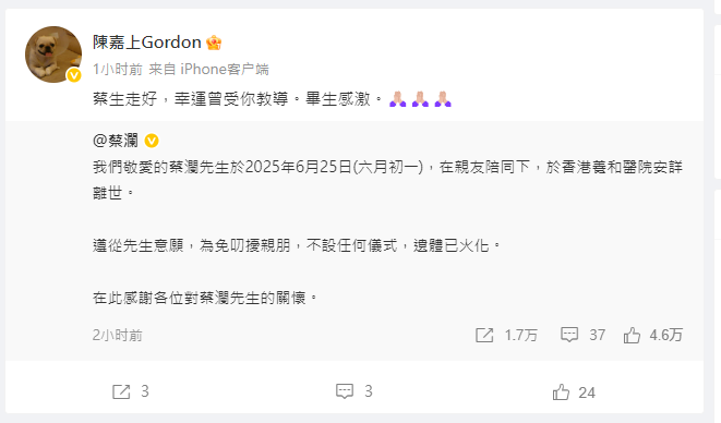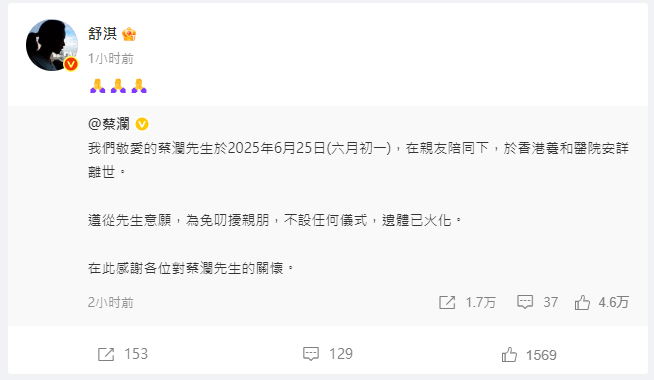 大公文匯全媒體報道,現年83歲、被譽為「香港四大才子」之一的蔡瀾今日(27日)傳出離世消息,蔡瀾的社交媒體寫道:「我們敬愛的蔡瀾先生於2025年6月25日(六月初一),在親友陪同下,於香港養和醫院安詳離世。遵從先生意願,為免叨擾親朋,不設任何儀式,遺體已火化。在此感謝各位對蔡瀾先生的關懷。」舒淇、陳法蓉、陳嘉上、楊迪、林依輪、陳曉卿等知名人士悼念蔡瀾。