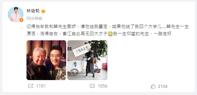 內地歌手林依輪曬蔡瀾贈予他的墨寶,「記得當年我和蔡先生撒嬌,請他送我墨寶,結果他送了我四個大字兒……蔡先生一生瀟灑,活得自在,香江自此再無四大才子。我一生仰望的先生,一路走好。」