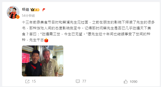 內地知名藝人楊迪亦發文悼念,回憶兩人一起錄節目。楊迪問蔡瀾是否已幾乎吃遍天下美食?答曰:「吃遍需三世,今生已無望。」