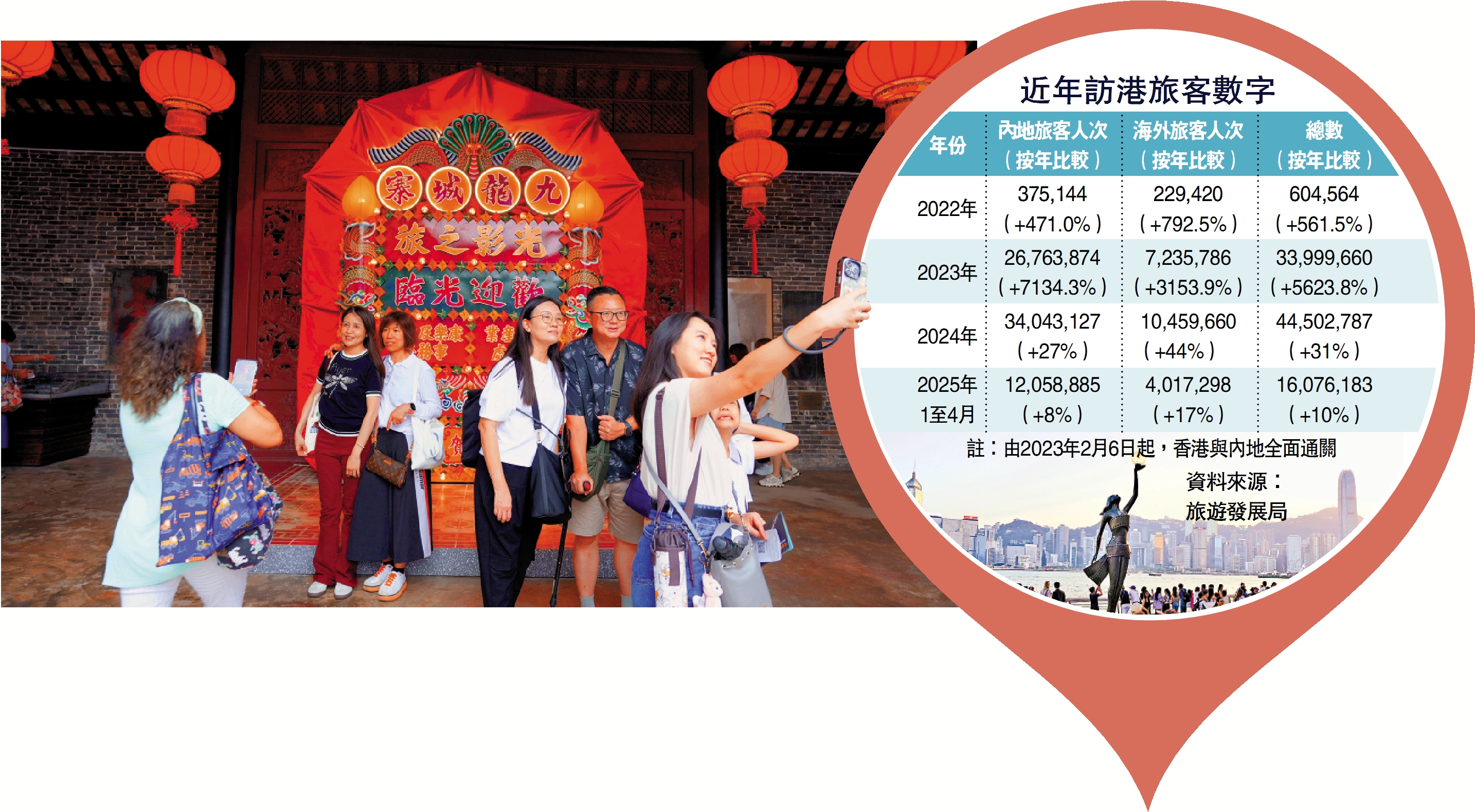 在特區政府連串旅遊措施下,旅遊業增長勢頭保持強勁,去年訪港旅客人次按年升三成,內地仍是最大的客源市場,旅客人次按年增27%,非內地旅客增長更顯著,按年升44%,東南亞市場表現尤其強勁,長途市場包括美國、加拿大、澳洲、歐洲,訪港旅客人次按年各增加約50%。旅發局預計,今年全年訪港旅客可望達4900萬人次,按年升約10%。
