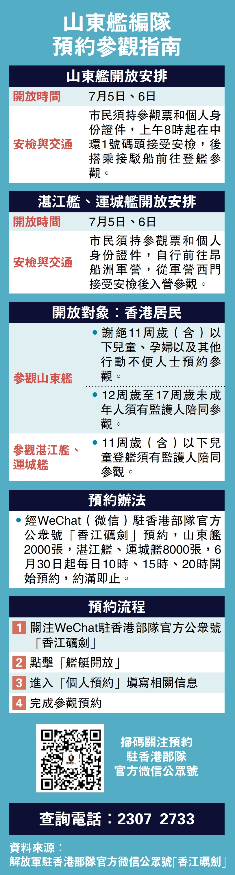 香港回歸以來,我國海軍現代化艦艇編隊曾先後8次訪港,展現中央對香港關愛有加。「能一睹我國現代化戰艦雄偉英姿,令人既激動又振奮。」對於山東艦訪港,香港各界熱切期待。解放軍駐港部隊昨日發布公告,通過WeChat(微信)駐香港部隊官方公眾號「香江礪劍」線上發放參觀票10000張,其中山東艦2000張,湛江艦、運城艦8000張,6月30日起開始接受香港市民預約,約滿即止。