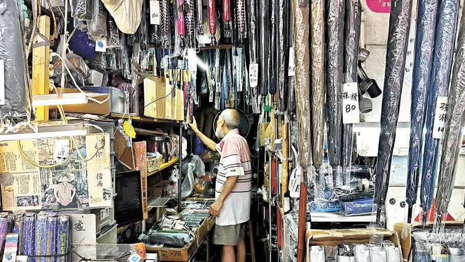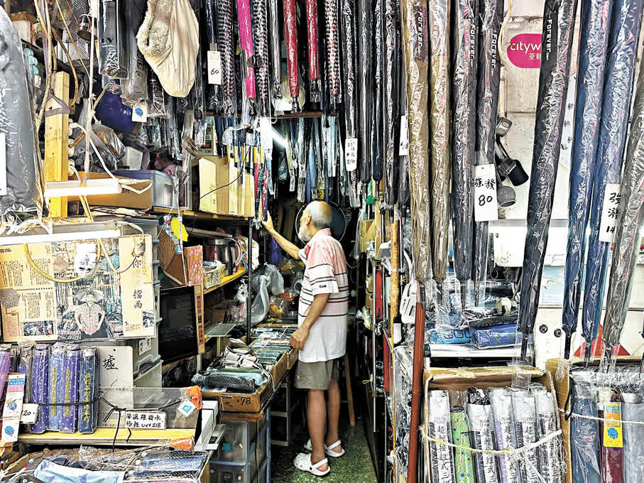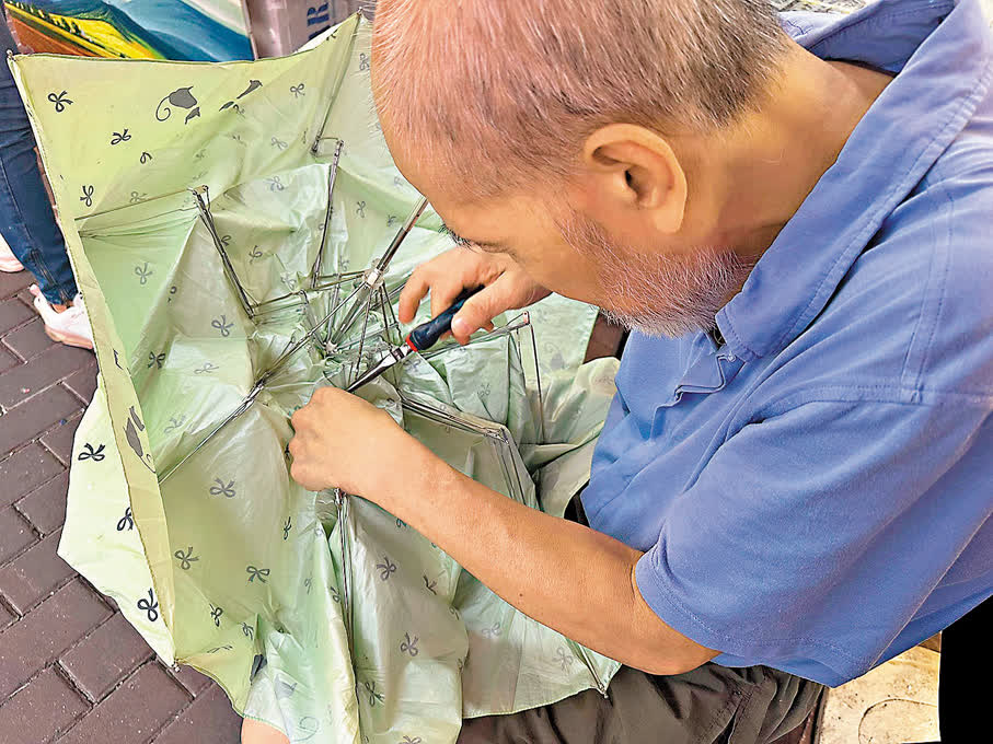 如今,「新藝城傘皇」蜷縮在深水埗肉檔與菜攤之間,月租八千,勉強維持生計。威哥坦言,靠修傘「想發達就冇啦」。有客人因傘柱零件脫落,他配顆螺絲收20元,對方卻硬塞30元;更多時候,他花一個多小時接駁斷裂的傘骨,僅收80元。「計時薪?蝕到入肉啦!」他笑着搖頭。