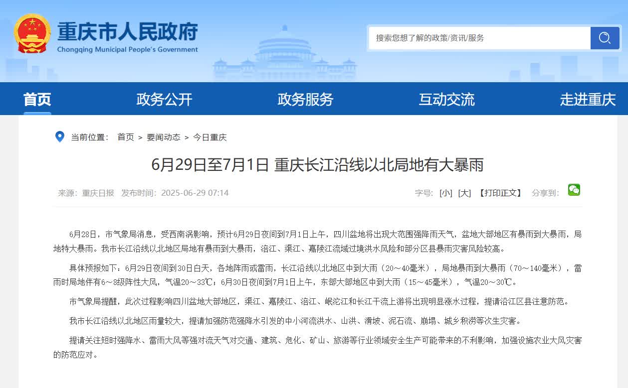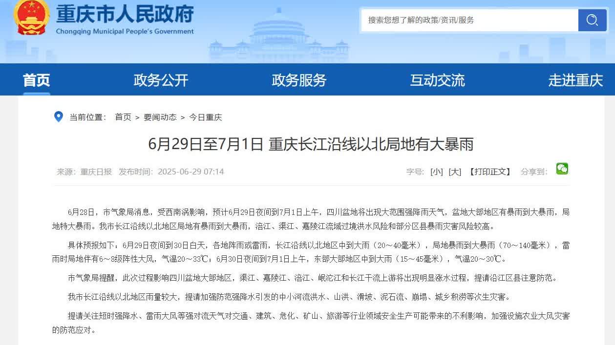 據氣象台預測,6月29日夜間到30日夜間,長江沿線及以北地區有大到暴雨,局地大暴雨,其中岷沱江、涪江、嘉陵江、渠江流域的部分地區有暴雨到大暴雨,局地特大暴雨。