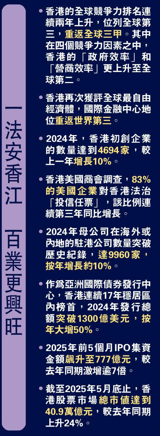 國際地緣政治衝突升溫,貿易保護主義抬頭,美國濫施關稅、挑起戰爭衝突,正為全球政經形勢帶來更多不穩定因素。形勢越是複雜,安全就越重要。香港國安法,讓香港有了應對變局和挑戰的更強大底氣。