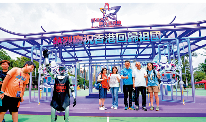 今年的「維園慶回歸」活動於昨日起至7月1日舉行,市民可免費入場參觀。場內分為三個展區,設六大回歸主題打卡裝置,包括入口處的中國古代門樓設計,兩側設有莊嚴威武的獅子,將傳統中華藝術與現代科技感結合;場內的「茶餐廳」、「理髮」等色彩斑斕的港式舊招牌,吸引不少市民及老香港回憶打卡留念。以國旗為設計靈感的「五星隧道」,內部有介紹牌,細數香港國際機場、啟德體育園等回歸以來落成的多個基建設施發展。