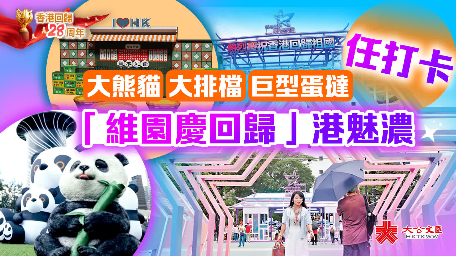 (大公報 記者 王亞毛)明天是香港回歸祖國28周年紀念日,香港各界慶典委員會舉辦的「維園慶回歸」,昨日(29日)起一連三日於銅鑼灣維多利亞公園舉辦,現場展出六大主題裝置,其中霓虹燈招牌長廊、大排檔和巨型蛋撻,展示地道香港特色,亦有約百隻憨態可掬的小型大熊貓裝置於草坪展出,吸引不少小朋友上前玩耍和拍照。