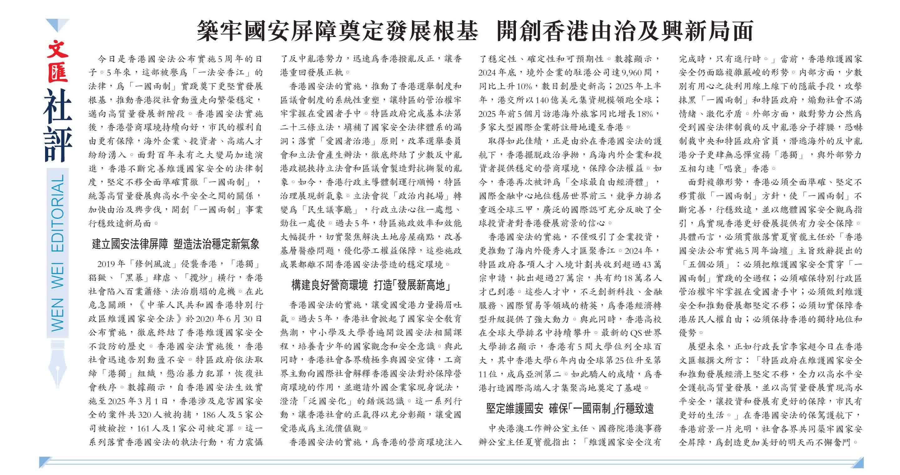 今日是香港國安法公布實施5周年的日子。5年來,這部被譽為「一法安香江」的法律,為「一國兩制」實踐奠下更堅實發展根基,推動香港從社會動盪走向繁榮穩定,邁向高質量發展新階段。香港國安法實施後,香港營商環境持續向好,市民的權利自由更有保障,海外企業、投資者、高端人才紛紛湧入。面對百年未有之大變局加速演進,香港不斷完善維護國家安全的法律制度,堅定不移全面準確貫徹「一國兩制」,統籌高質量發展與高水平安全之間的關係,加快由治及興步伐,開創「一國兩制」事業行穩致遠新局面。