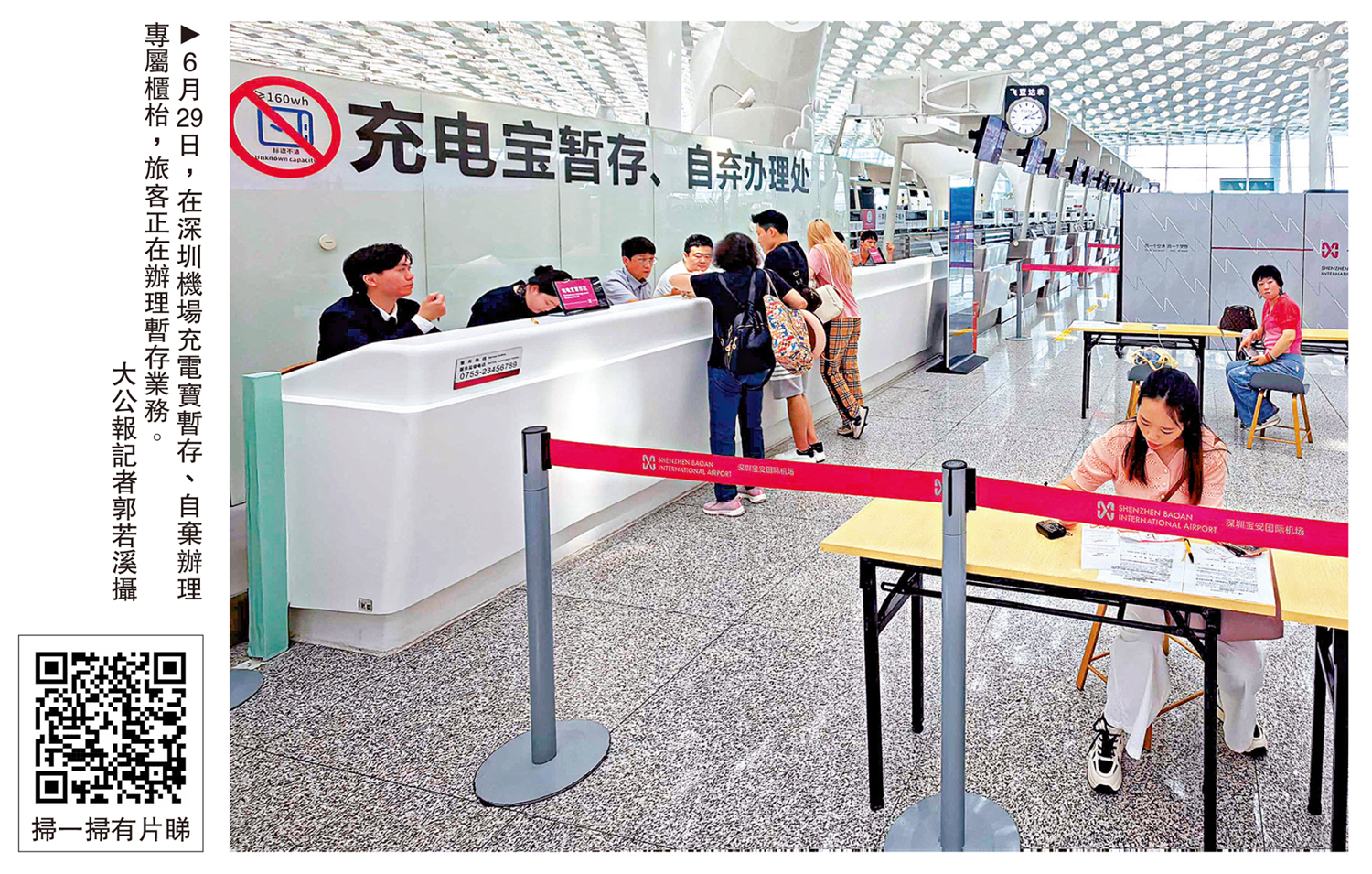 29日下午,大公報記者在深圳機場現場走訪看到,機場值機、安檢、暫存辦理及快遞服務等現場整體平穩有序,增派工作人員主動幫助旅客識別充電寶型號,並為旅客辦理暫存進行引導。現場工作人員告訴記者,一個上午的時間,就有近千個充電寶在此寄存。機場將這些充電寶提供7天暫存服務。