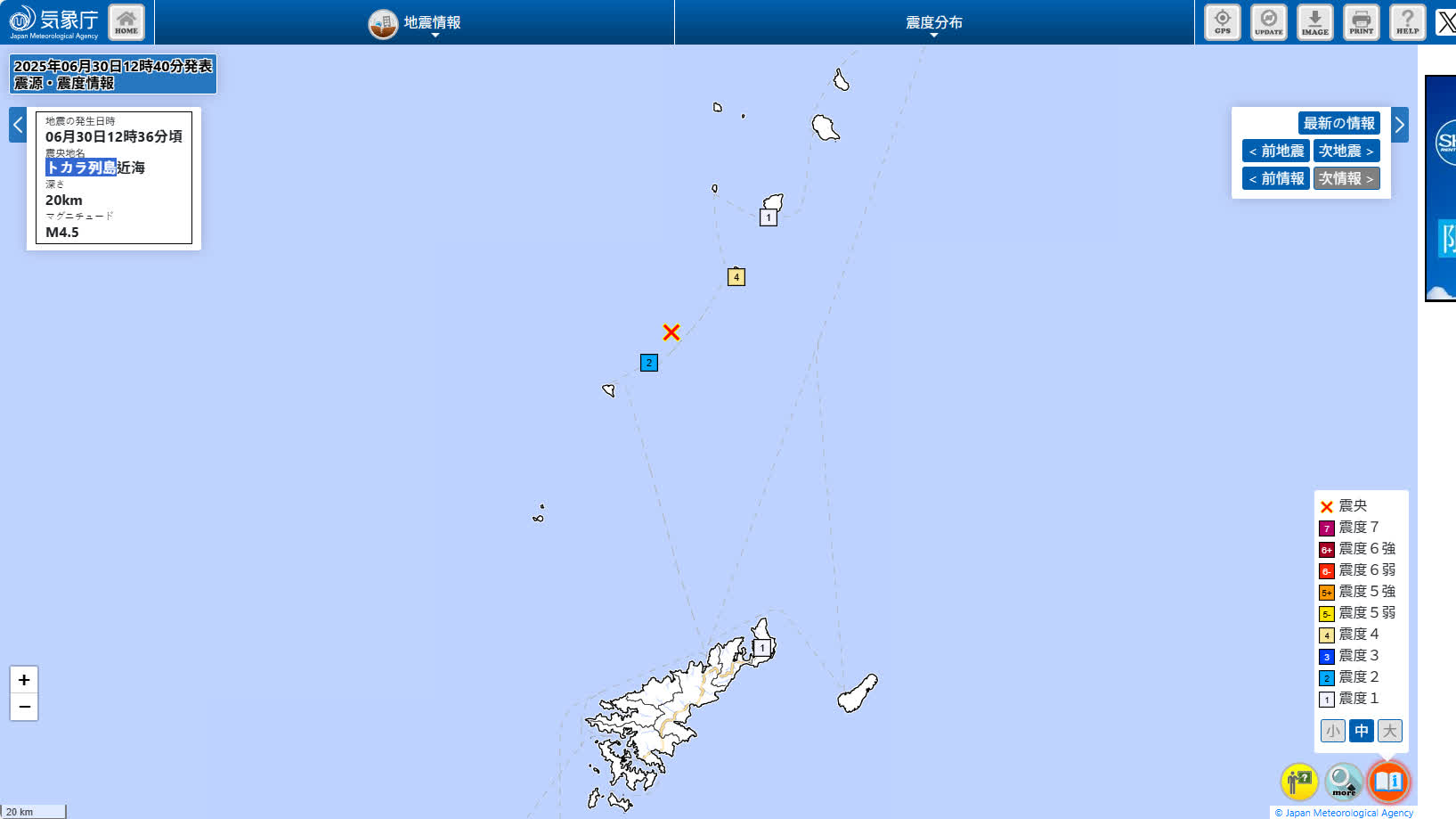 大公文匯全媒體報道,日本鹿兒島吐噶喇群島外海於當地時間6月30日中午12時36分(香港時間上午11時36分)再度發生地震。據日本氣象廳監測,地震規模初估為4.5級,震央位於吐噶喇群島外海,震源深度約20公里,令多個地區感受到強烈震感。