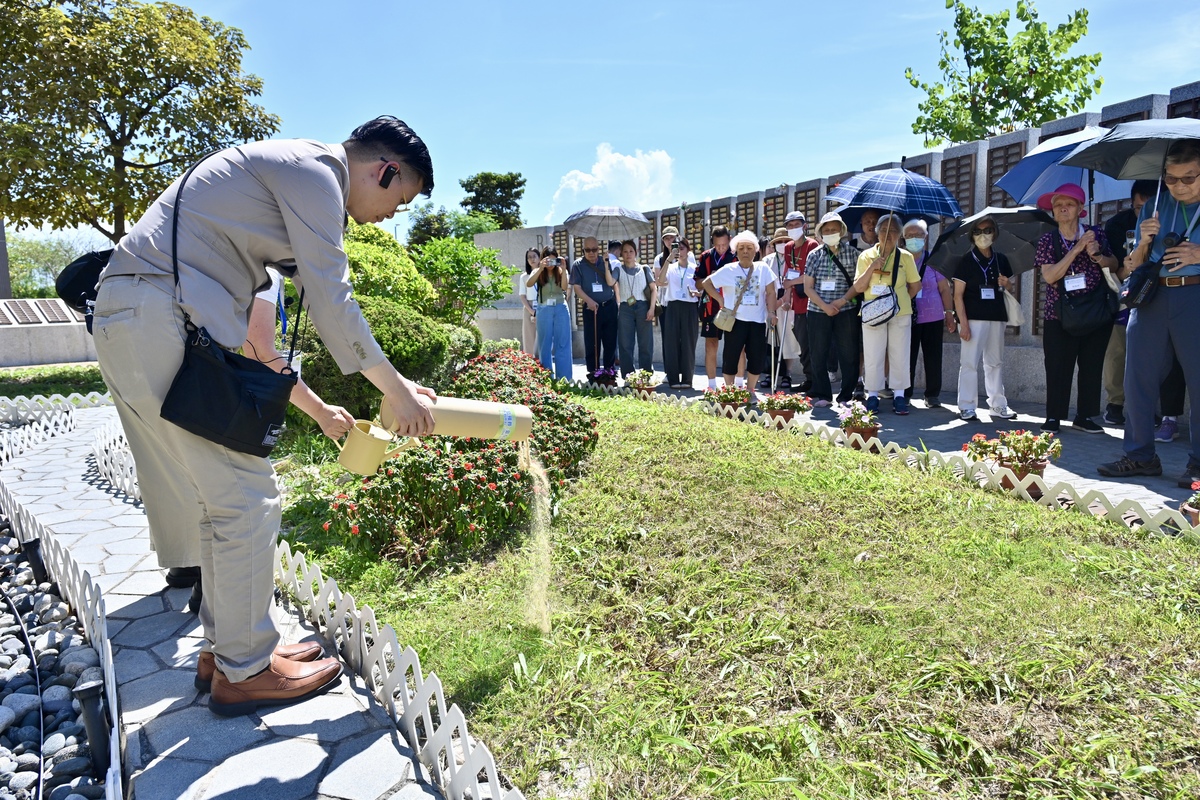 「撒灰時要注意是否逆風,否則骨灰可能吹到自己腳上。」撒灰後,家屬可使用澆水壺灌溉草地,幫助骨灰融入土壤、滋養大地。