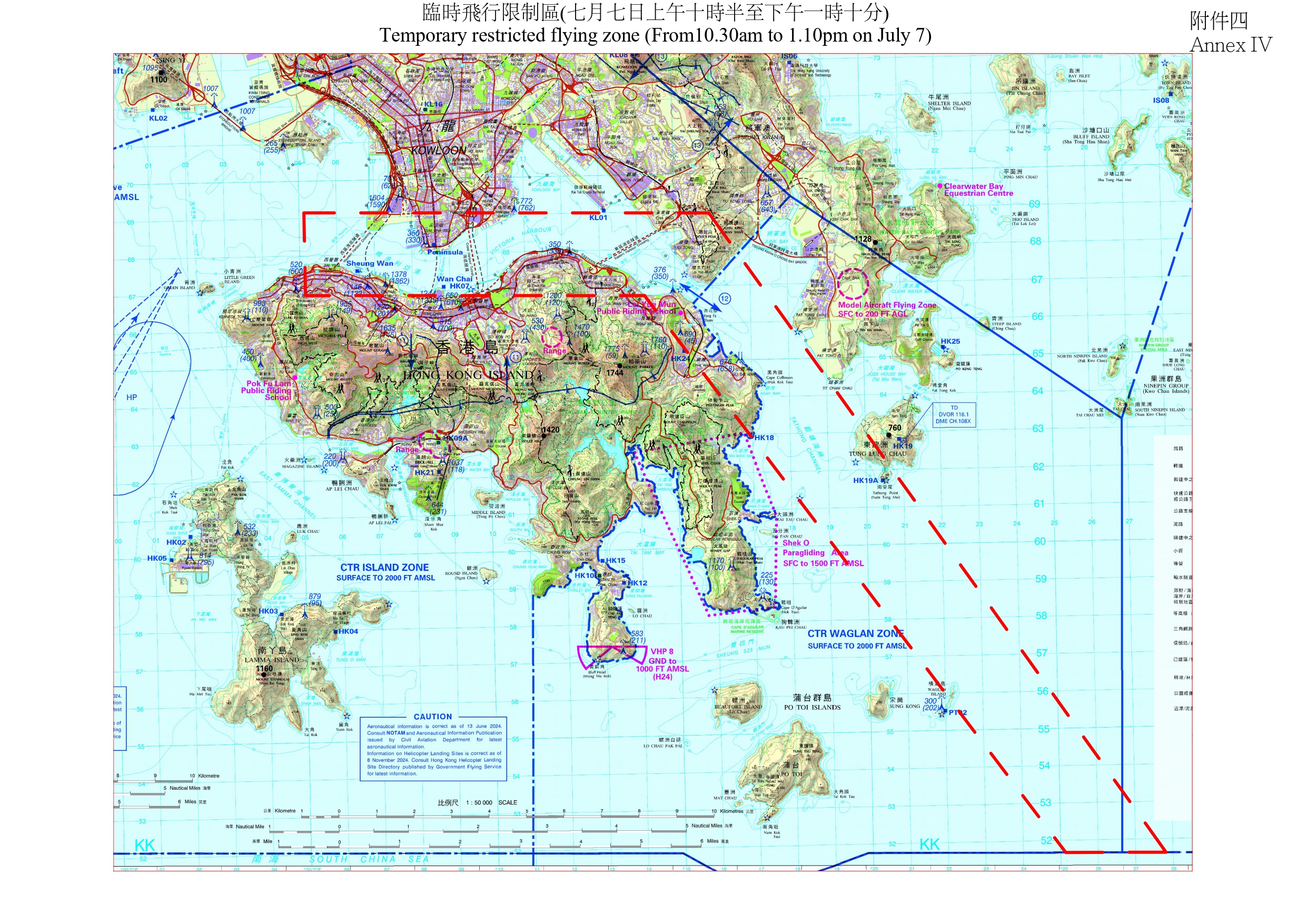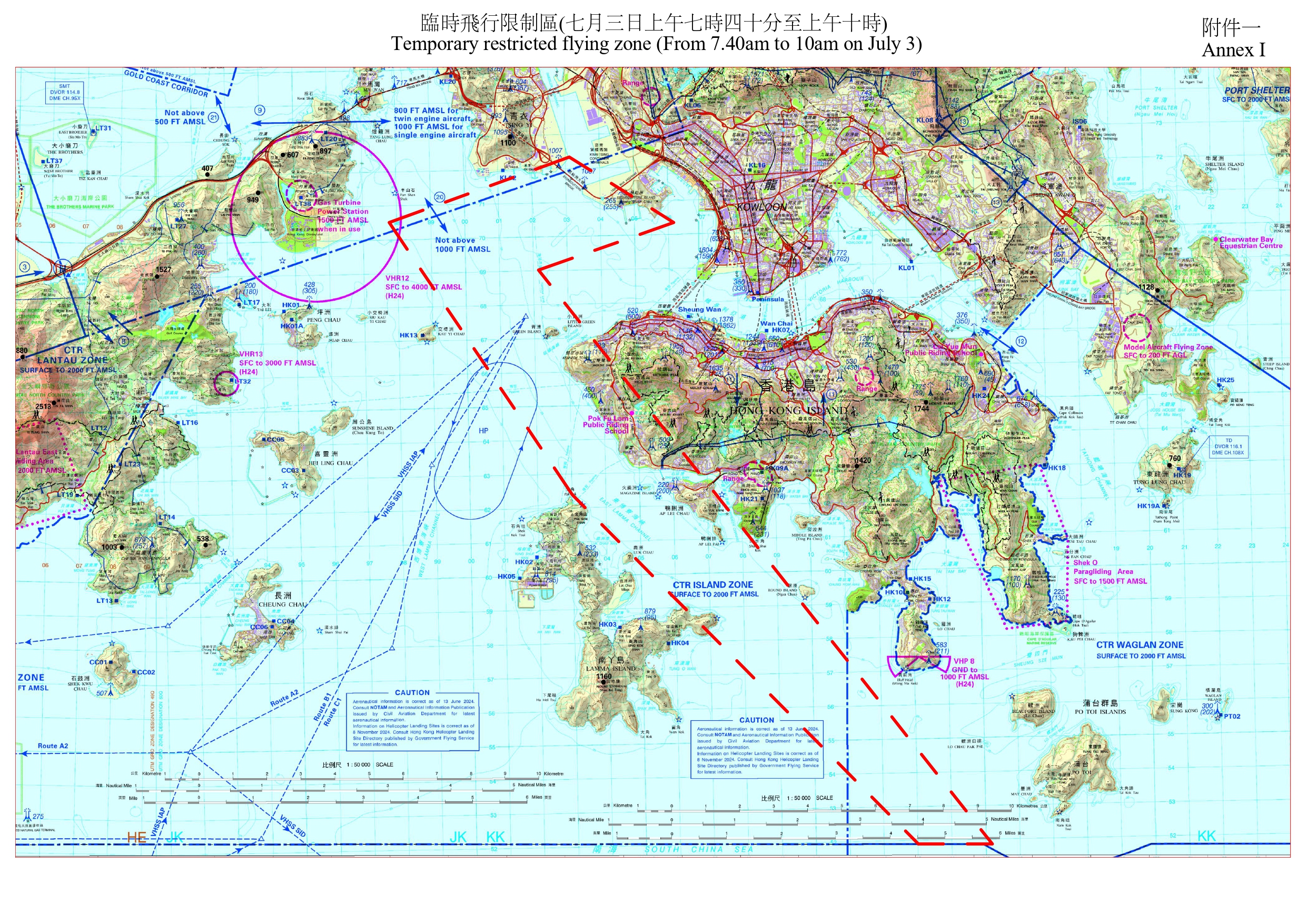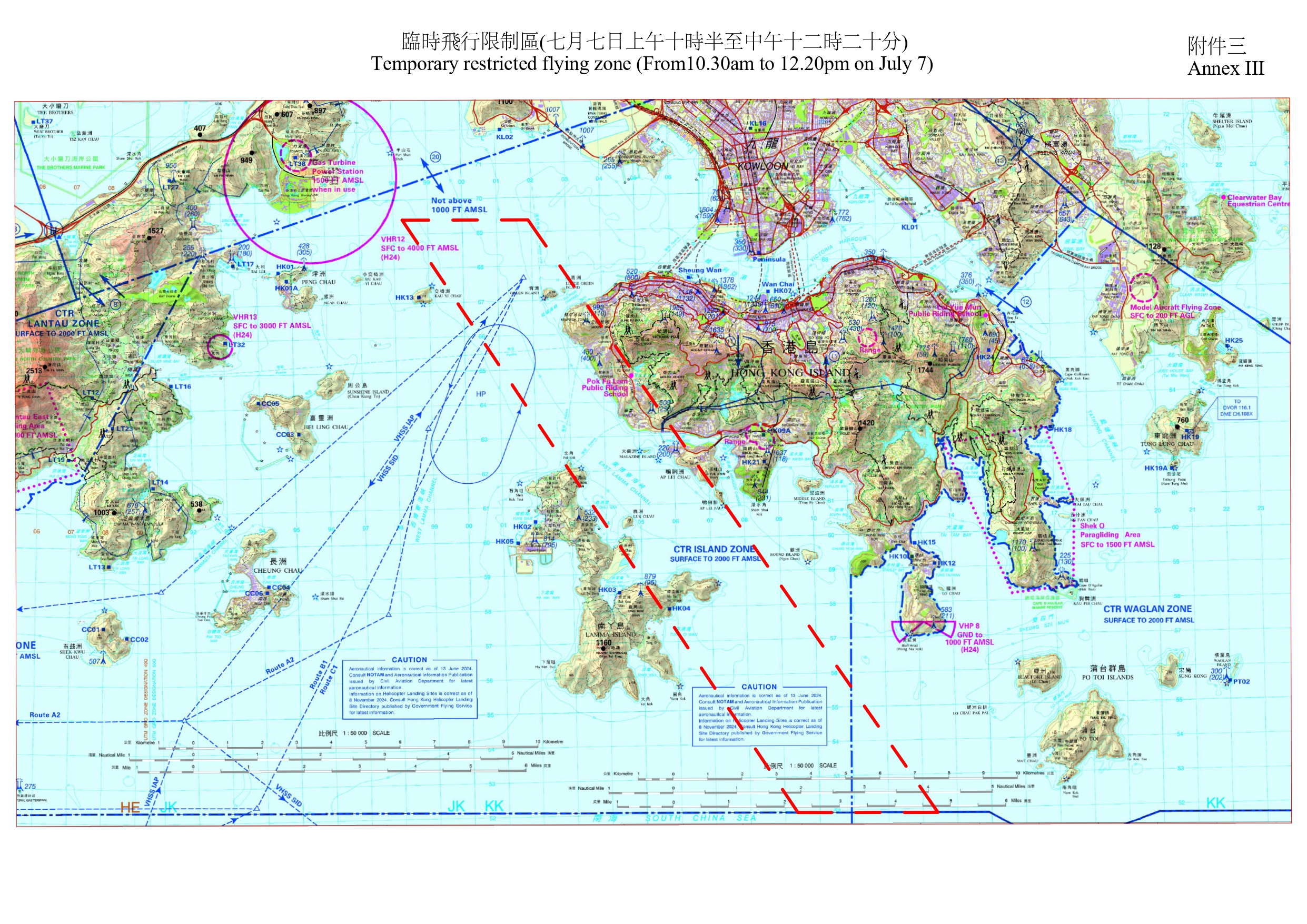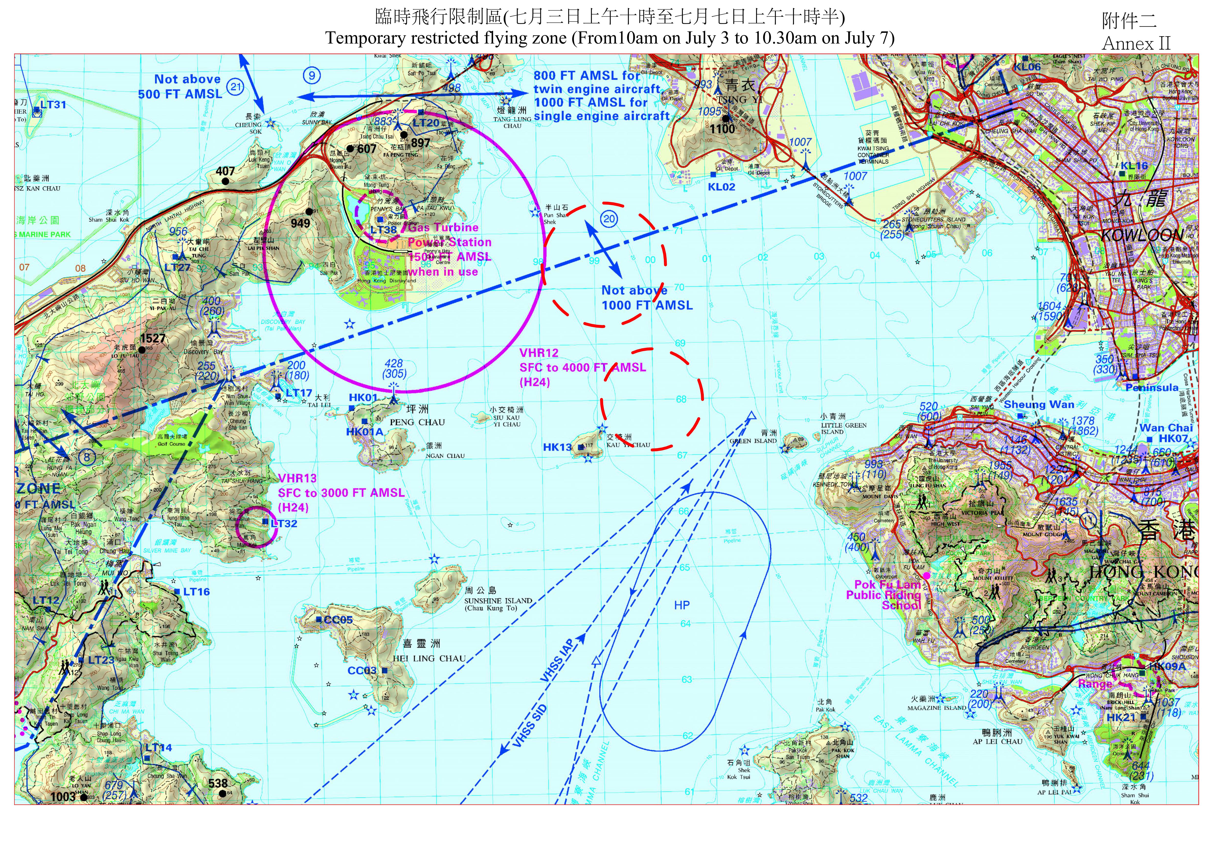 民航處發言人指,為配合特別活動,民航處將在東博寮海峽、維多利亞港西面錨地、維多利亞港以及藍塘海峽一帶設立臨時飛行限制區,生效時間為7月3日至7日的若干時段。除政府飛行服務隊航機外,所有航空器均不得進入有關範圍。臨時飛行限制區亦限制所有其他類型的飛行活動,例如放飛模型飛機、飄放風箏,及放飛繫留氣球或大量氣球等。