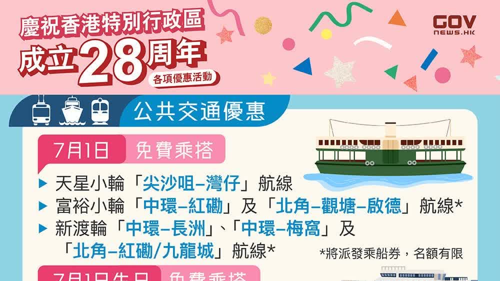 大公文匯全媒體報道,為慶祝香港特別行政區成立28周年,以下公共運輸服務營辦商明日(7月1日)會推出特別優惠,與民同樂共度節日: