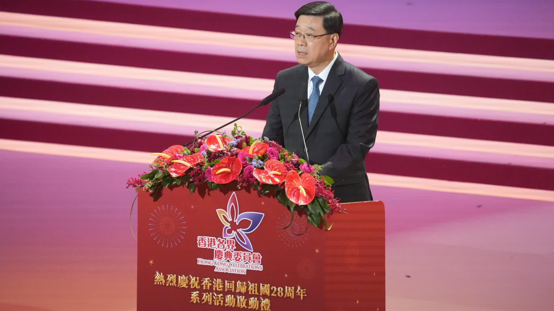 李家超又提到,特區政府今年慶祝回歸的主題是「攜手治及興,變革創未來」。特區政府將繼續全力發揮香港在「一國兩制」下內聯外通的優勢和作為「超級聯繫人」和「超級增值人」的角色。只要團結一致,社會各界與特區政府攜手努力,奮發前行,變革求新,共建更繁盛的香港,東方之珠將更加耀目璀璨。