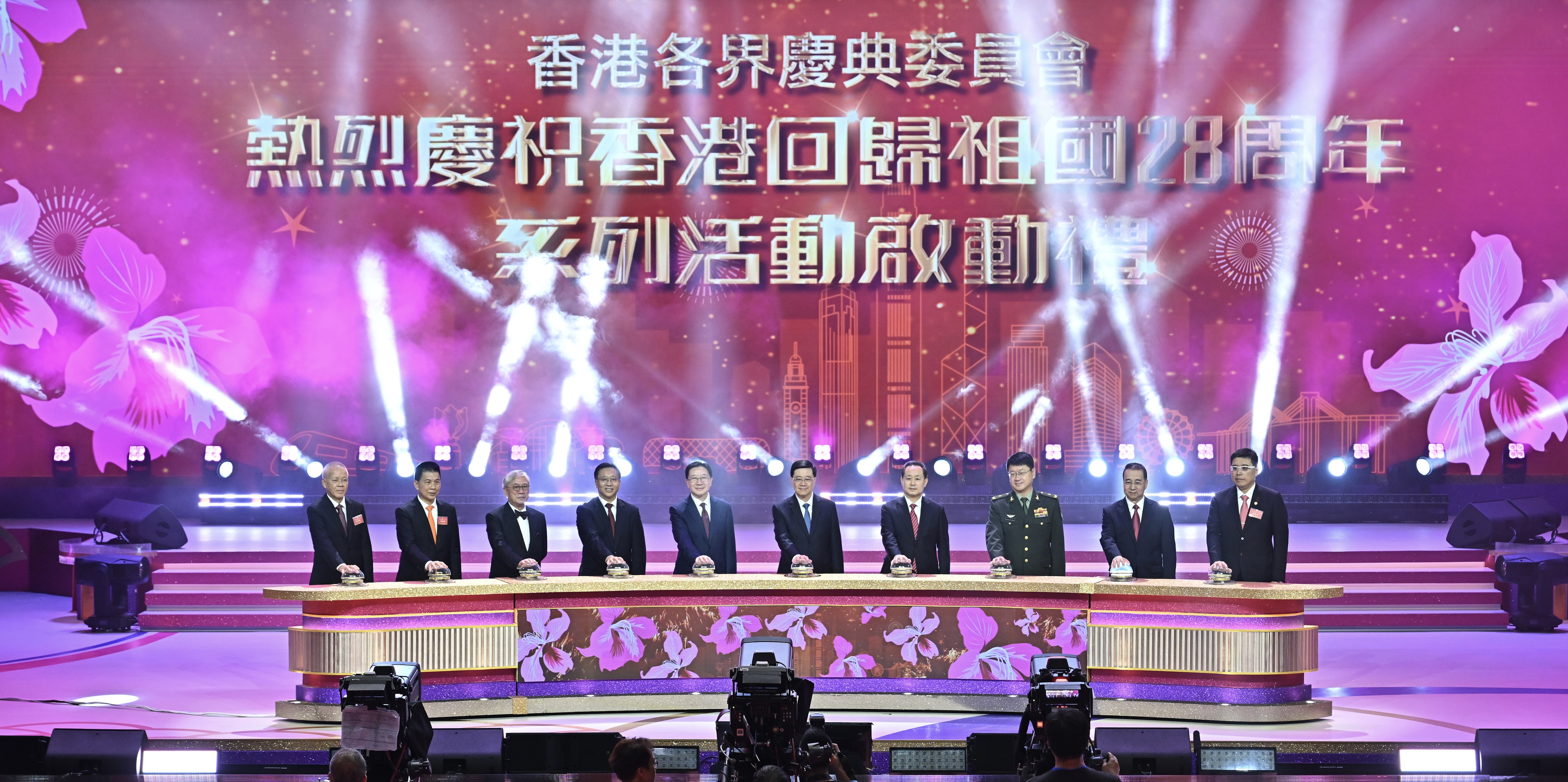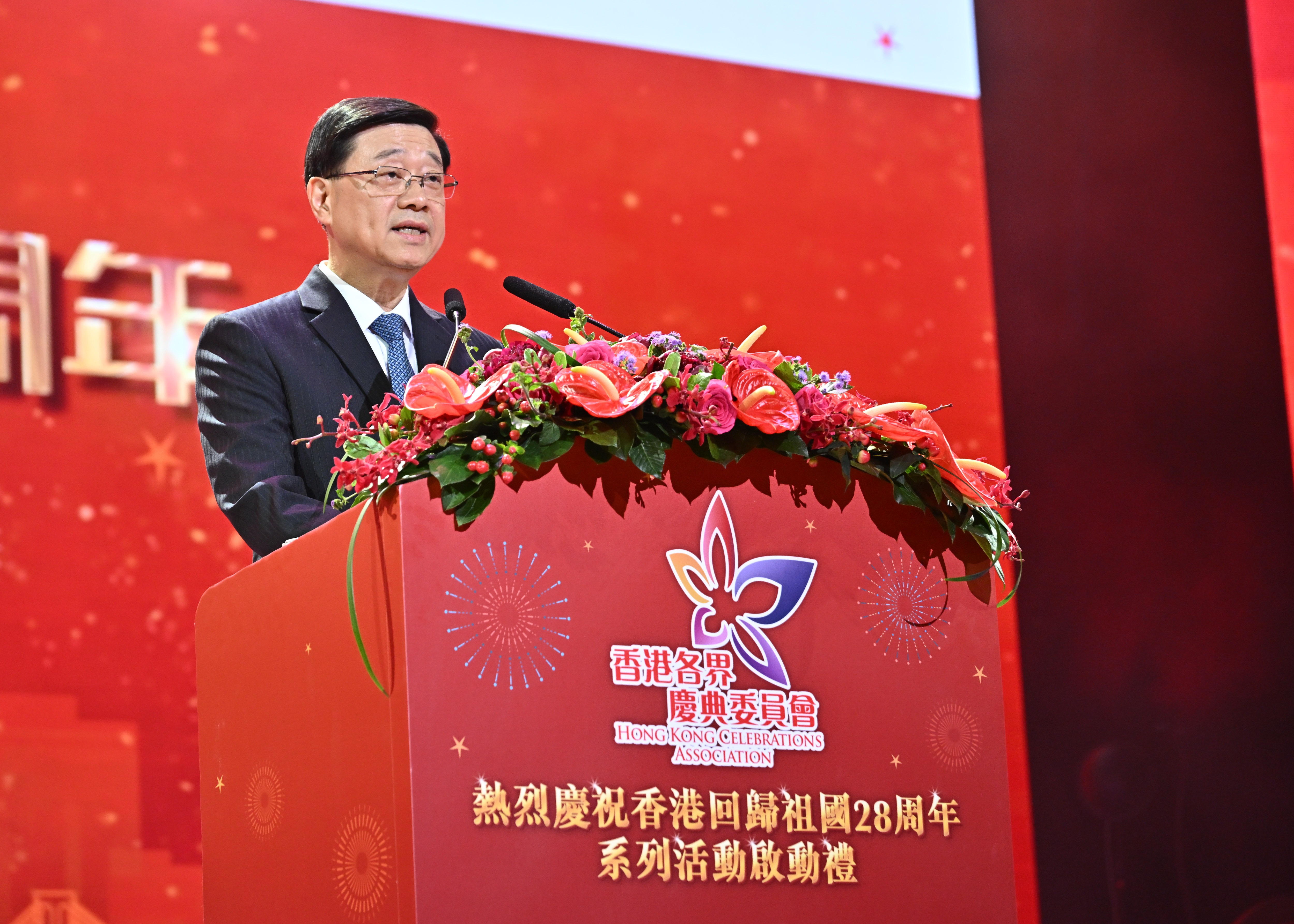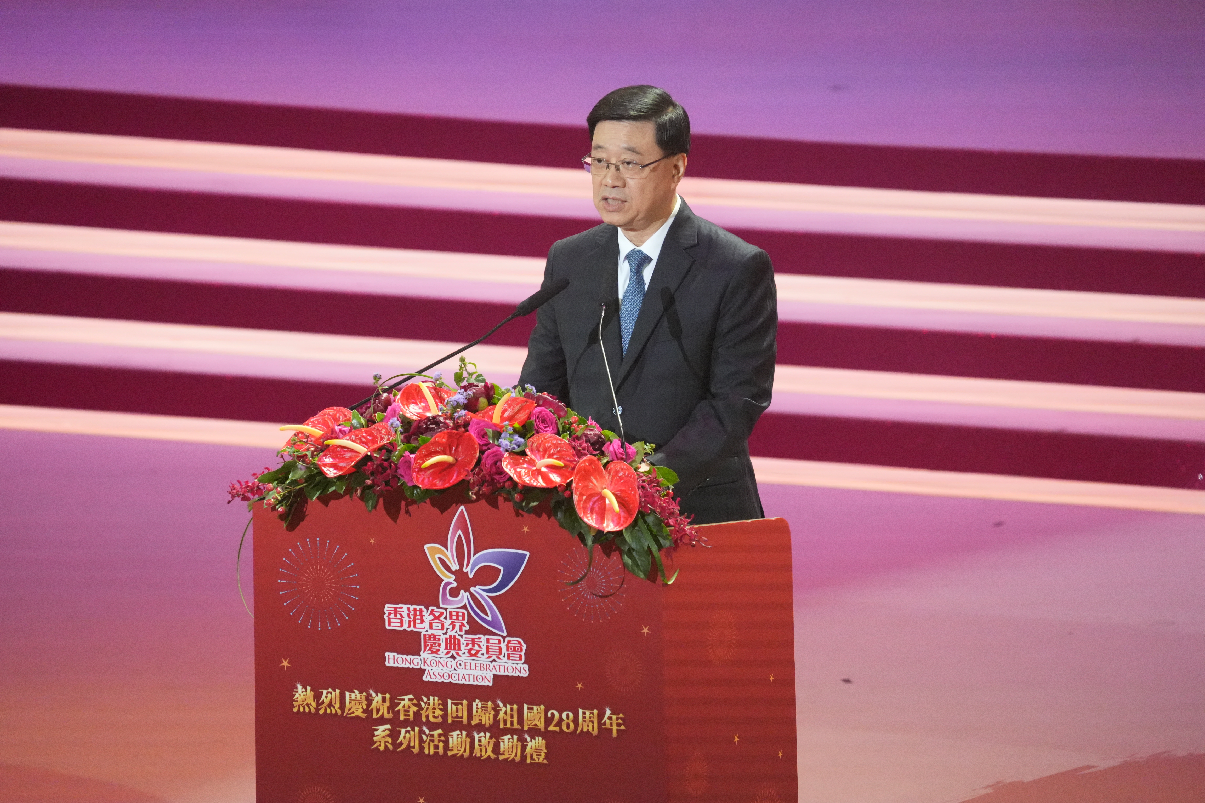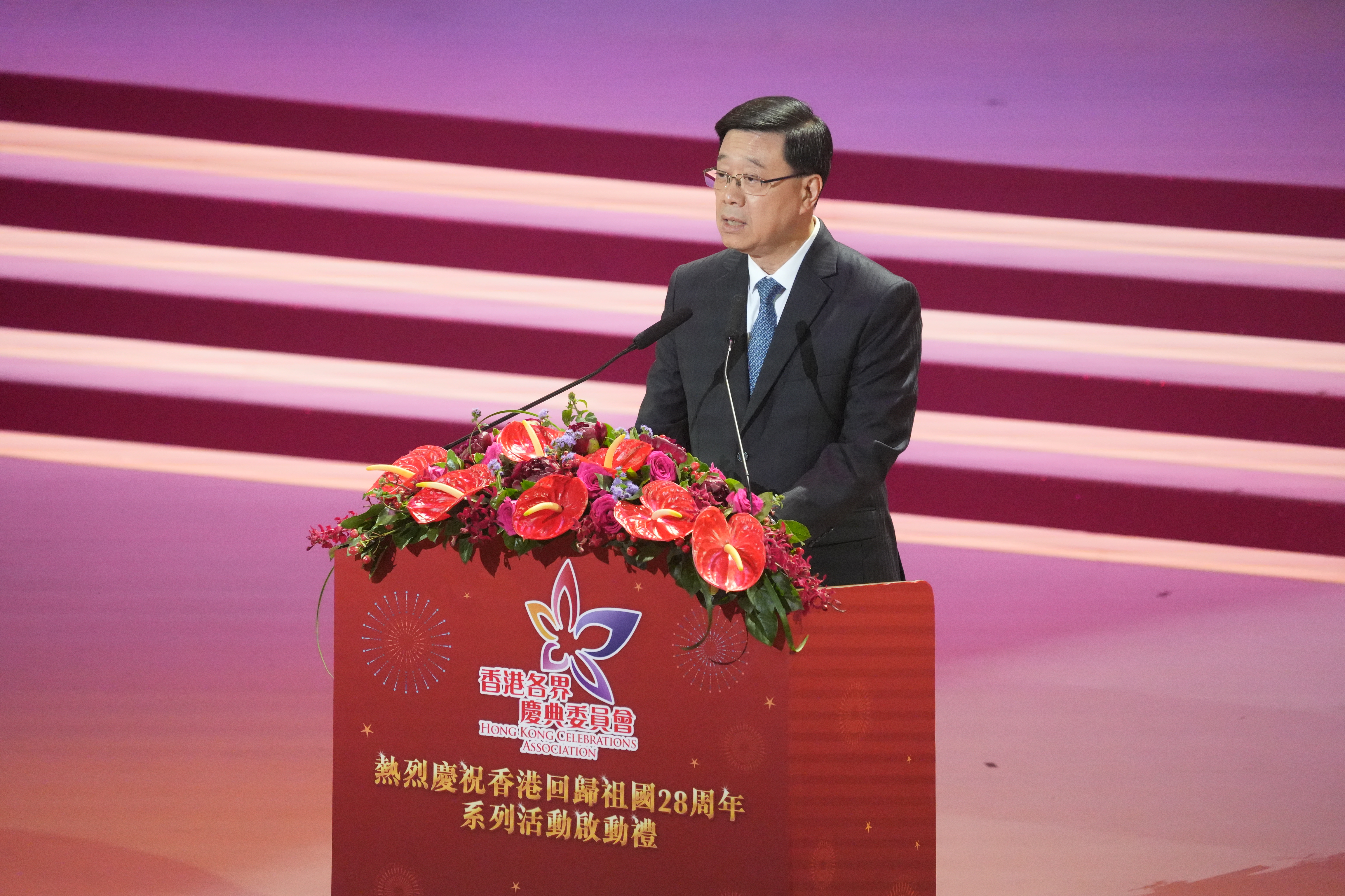 李家超指,為了慶祝香港回歸祖國28周年,香港各界慶典委員會以「星耀紫荊慶回歸」為主題,精心籌備了今天的晚會,邀請了歌唱家、藝人、合唱團和舞蹈團表演,可以說是第一批唱響「紅館」新定位的代表。